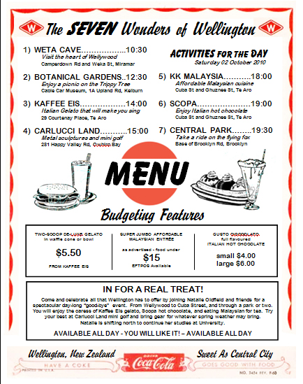 This invitation was so fun to make – it was for an all-day-long around-the-town drop-by-anytime day of activities, as a farewell “party” for my friend Natalie Oldfield. The invite is in the form of a menu, with the time for each event listed in military time where the price of the dish usually goes.