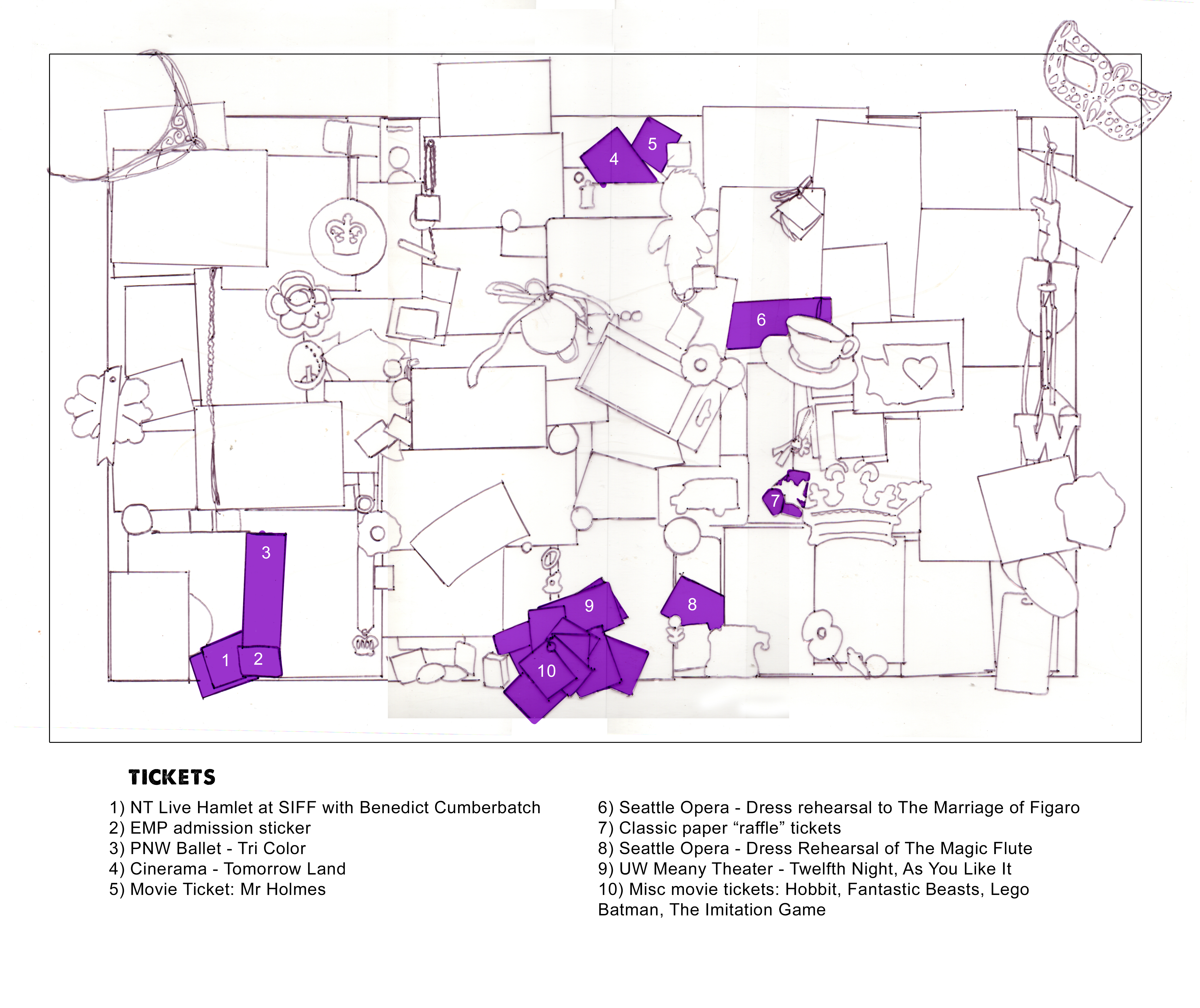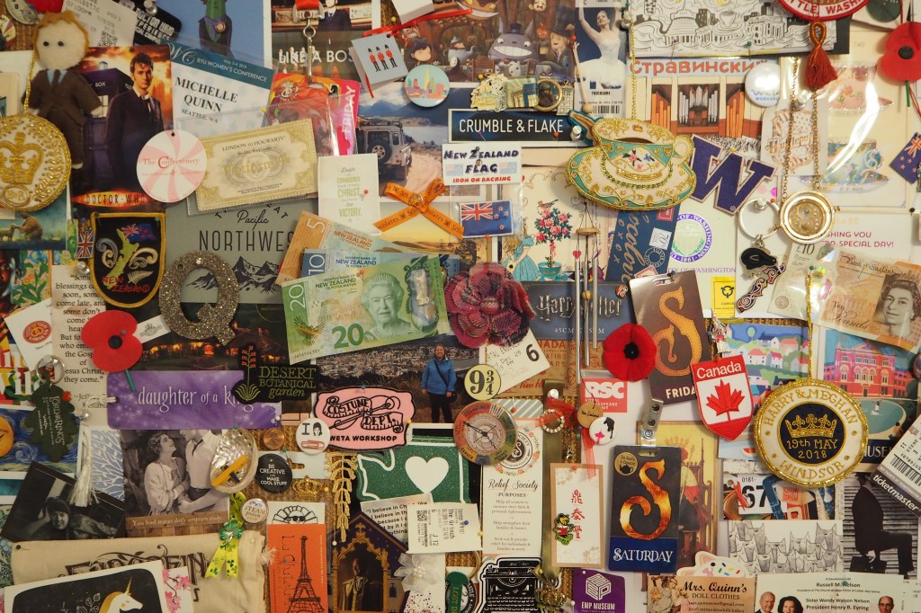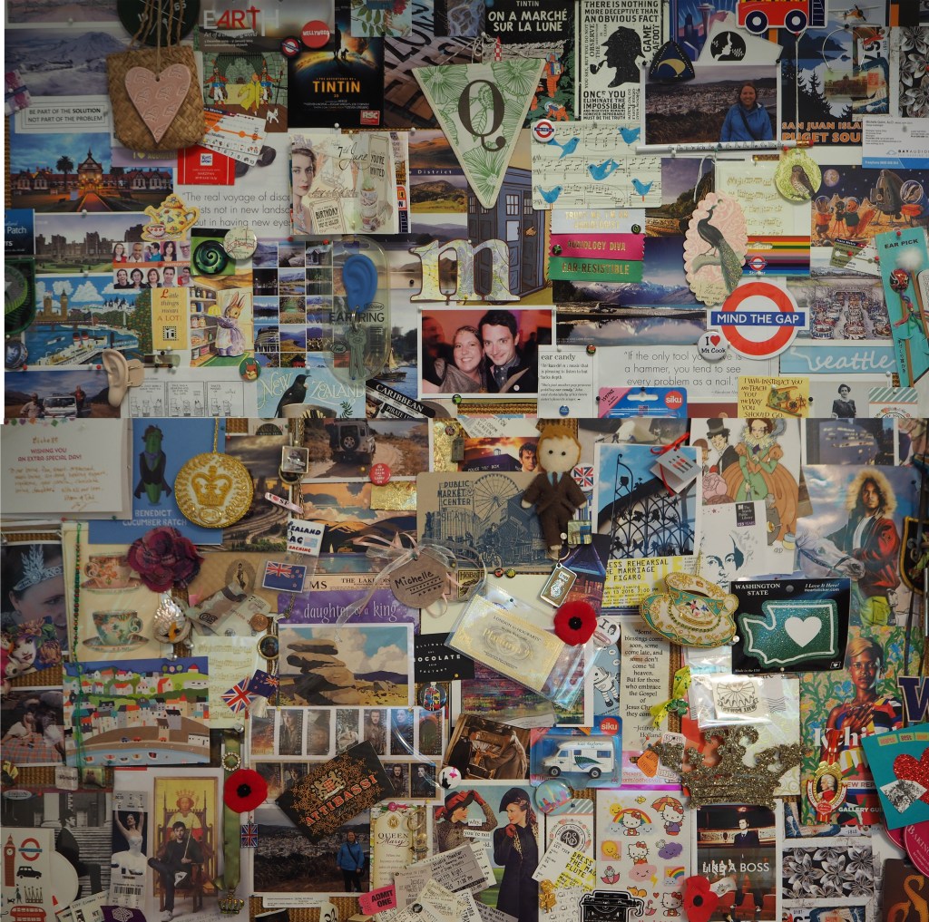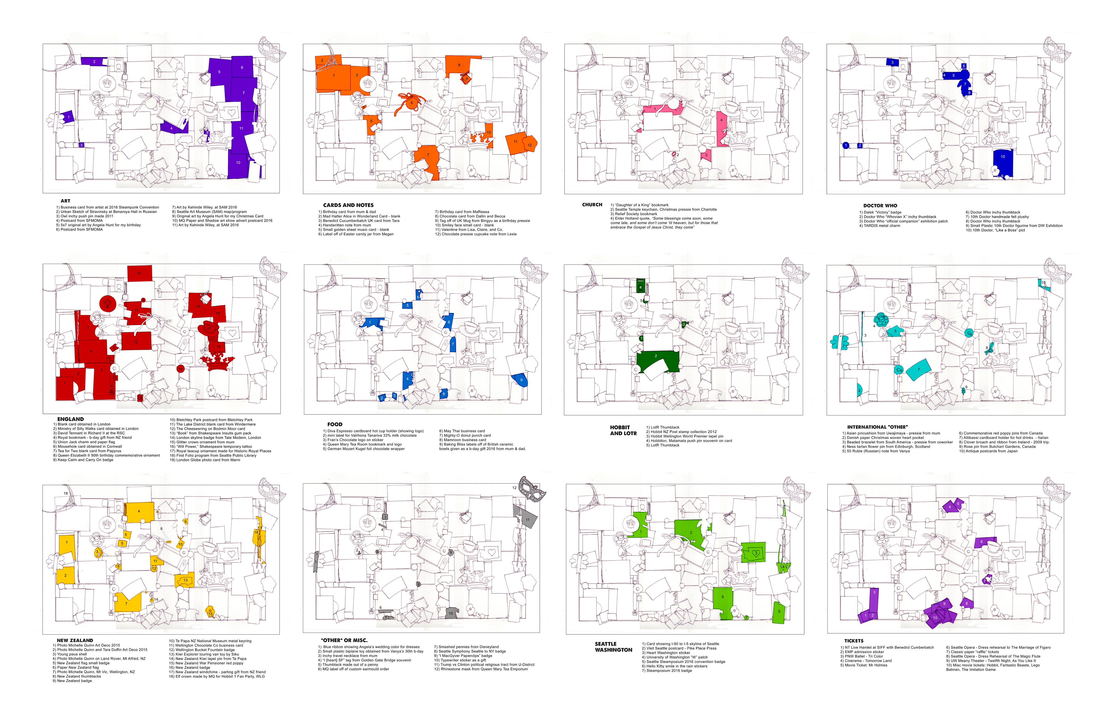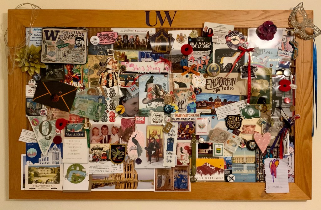 I had let my board grow for 2 years before this project. In a 2017 graphic design study / analytic effort, I mapped out my bulletin board according to category or theme. This exercise was an interesting way to see what such collected items said about me. The categories ended up being: Art, Cards & Notes, Church, Doctor Who, England, Food, Harry Potter, Hobbit/LotR, International “Other,” New Zealand, Seattle, Tickets, and Misc. Click to view details.
