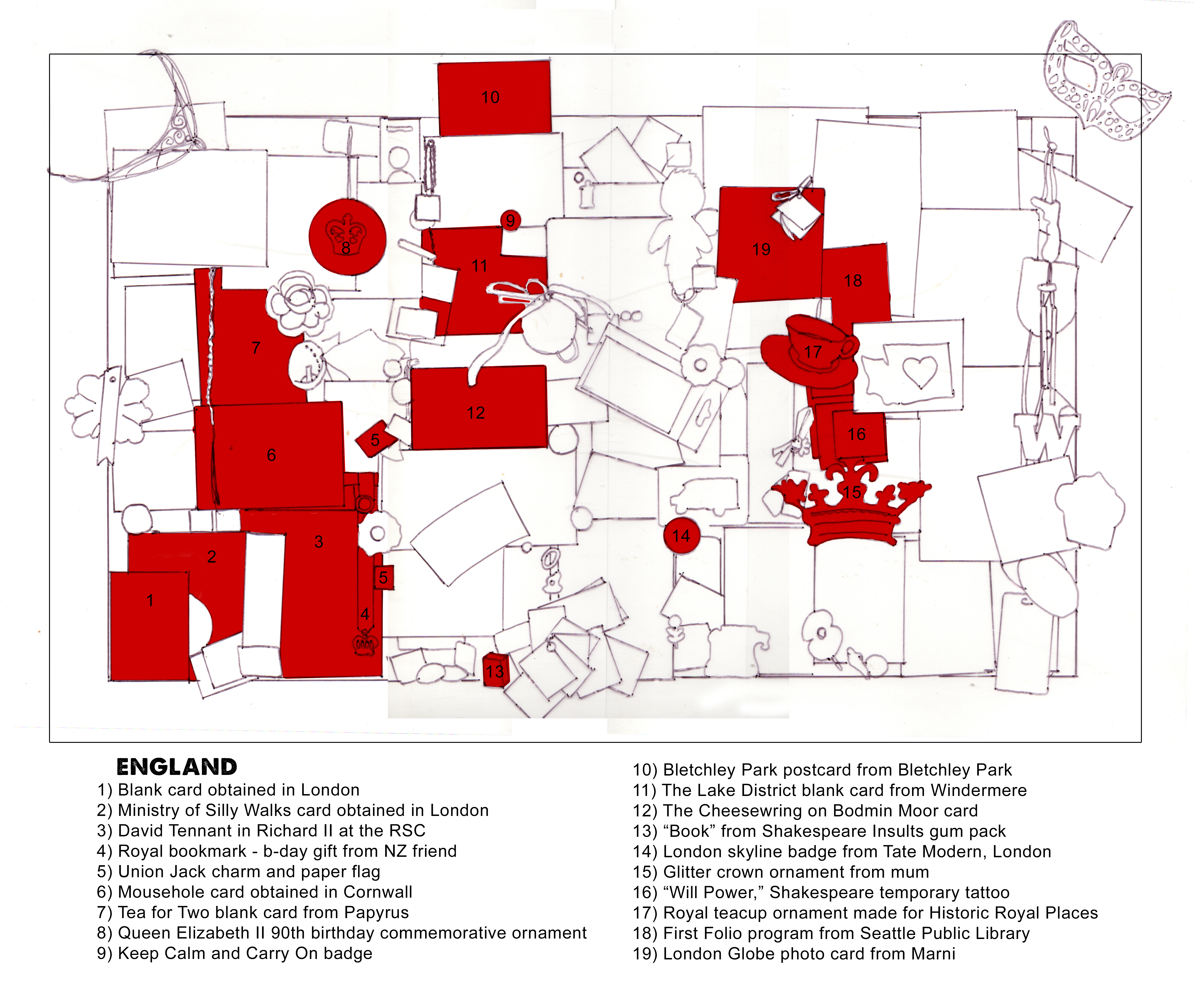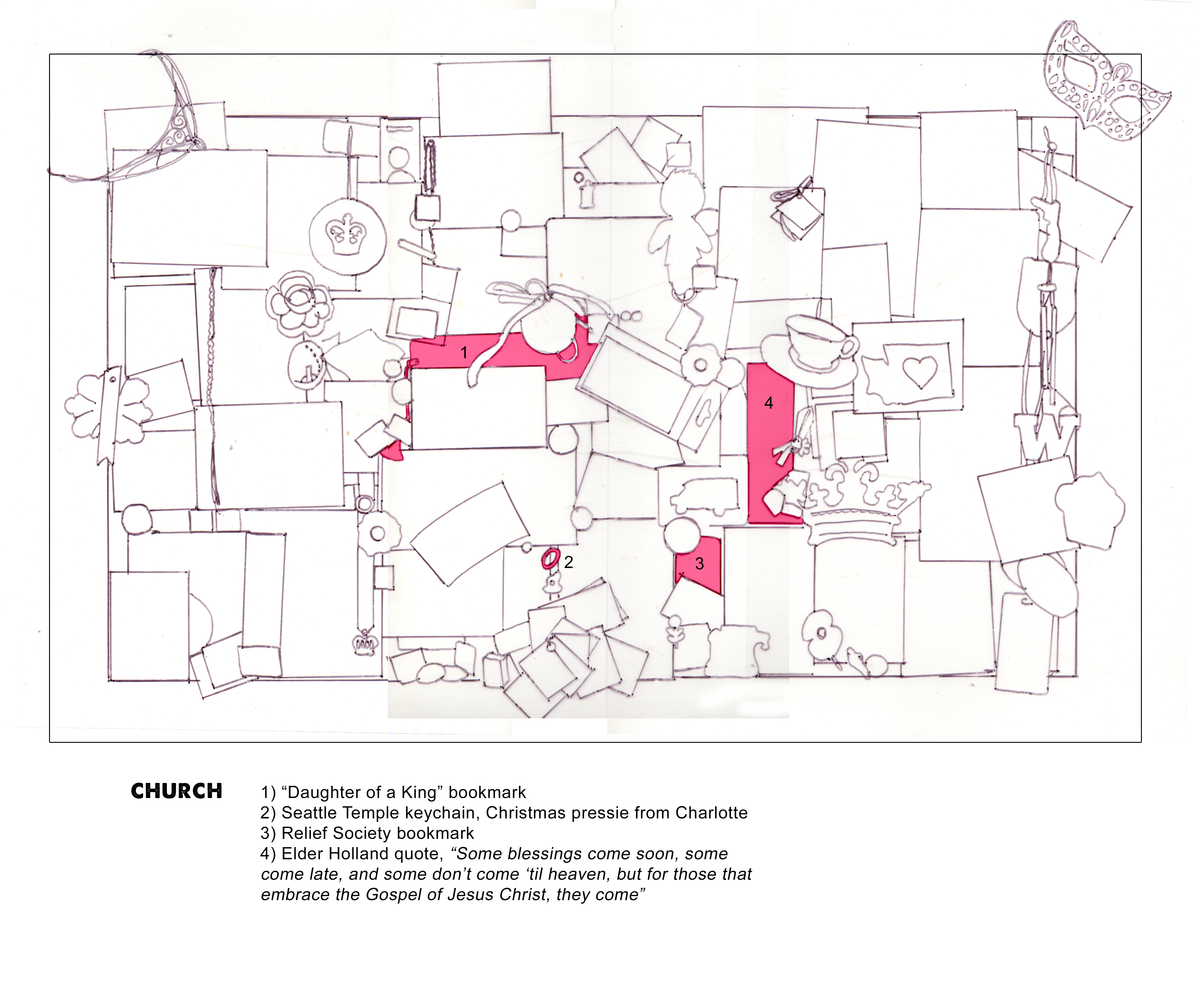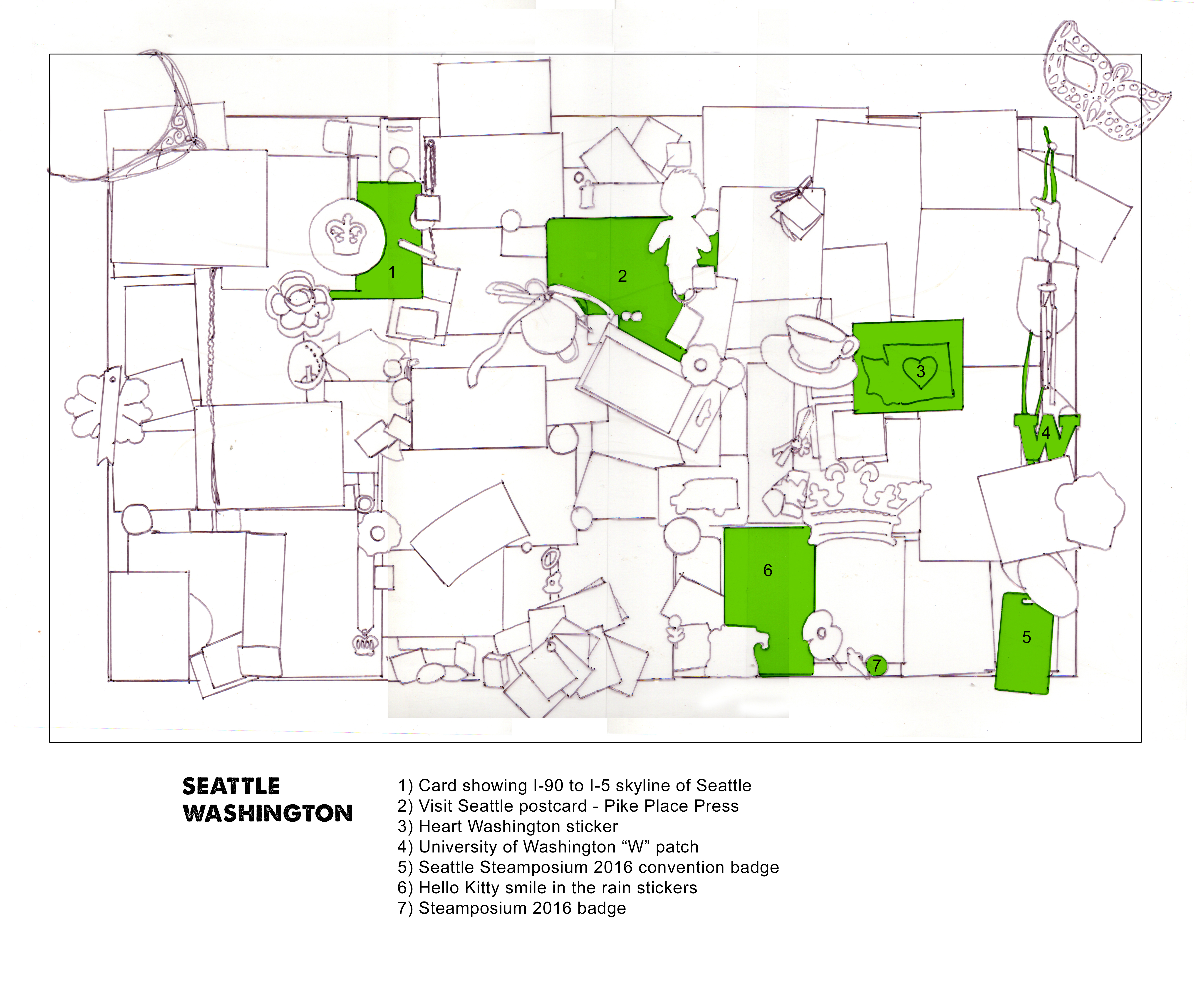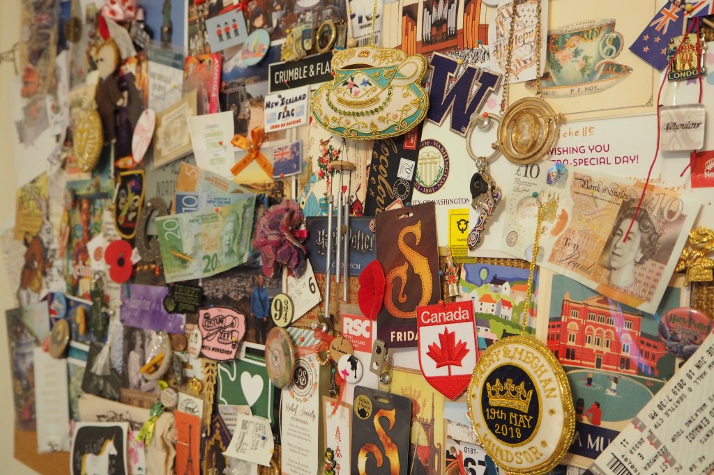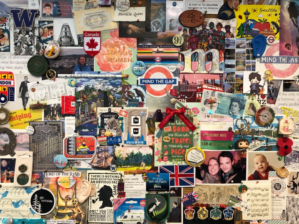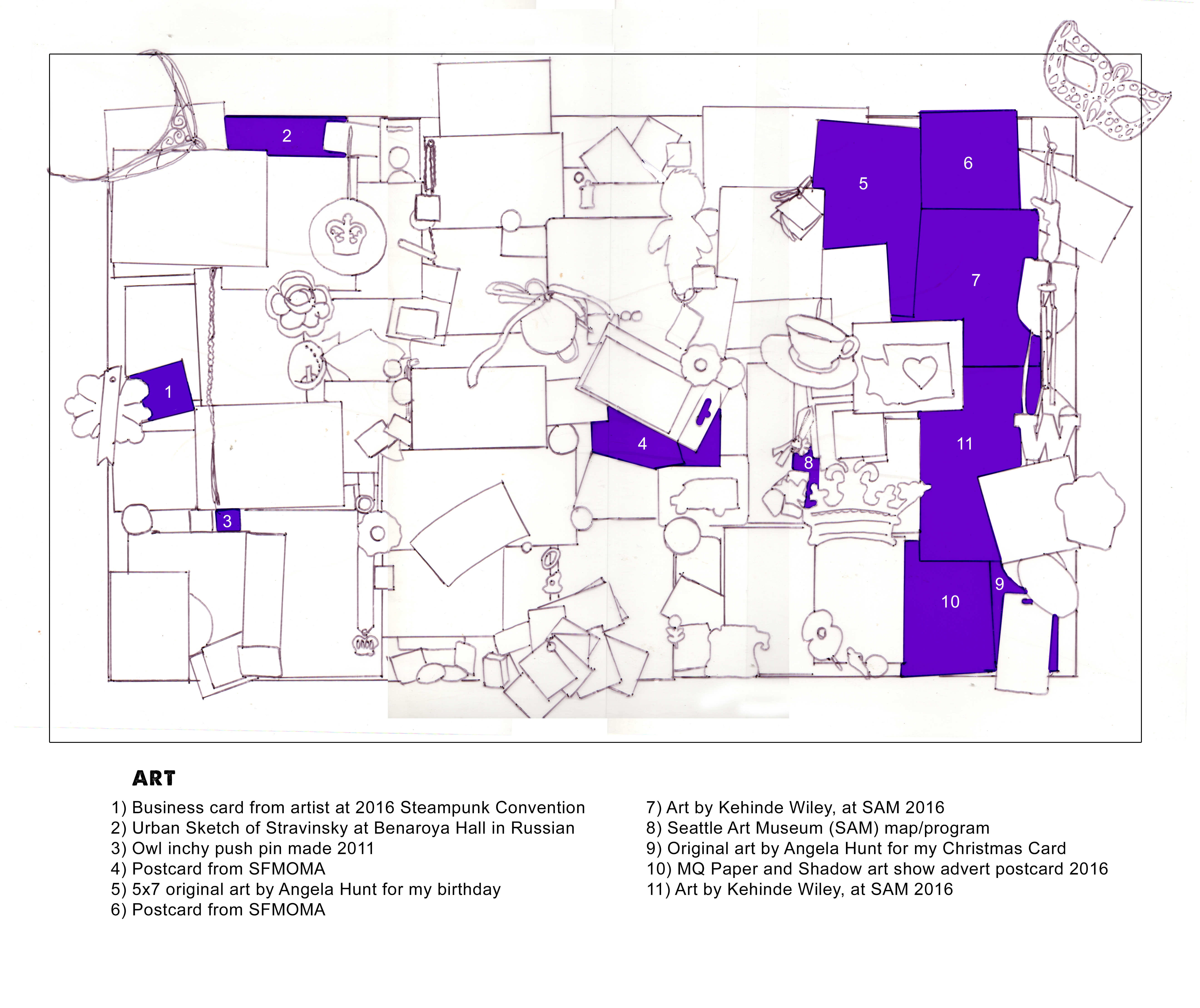 I had let my board grow for 2 years before this project. In a 2017 graphic design study / analytic effort, I mapped out my bulletin board according to category or theme. This exercise was an interesting way to see what such collected items said about me. The categories ended up being: Art, Cards & Notes, Church, Doctor Who, England, Food, Harry Potter, Hobbit/LotR, International “Other,” New Zealand, Seattle, Tickets, and Misc. Click to view details.