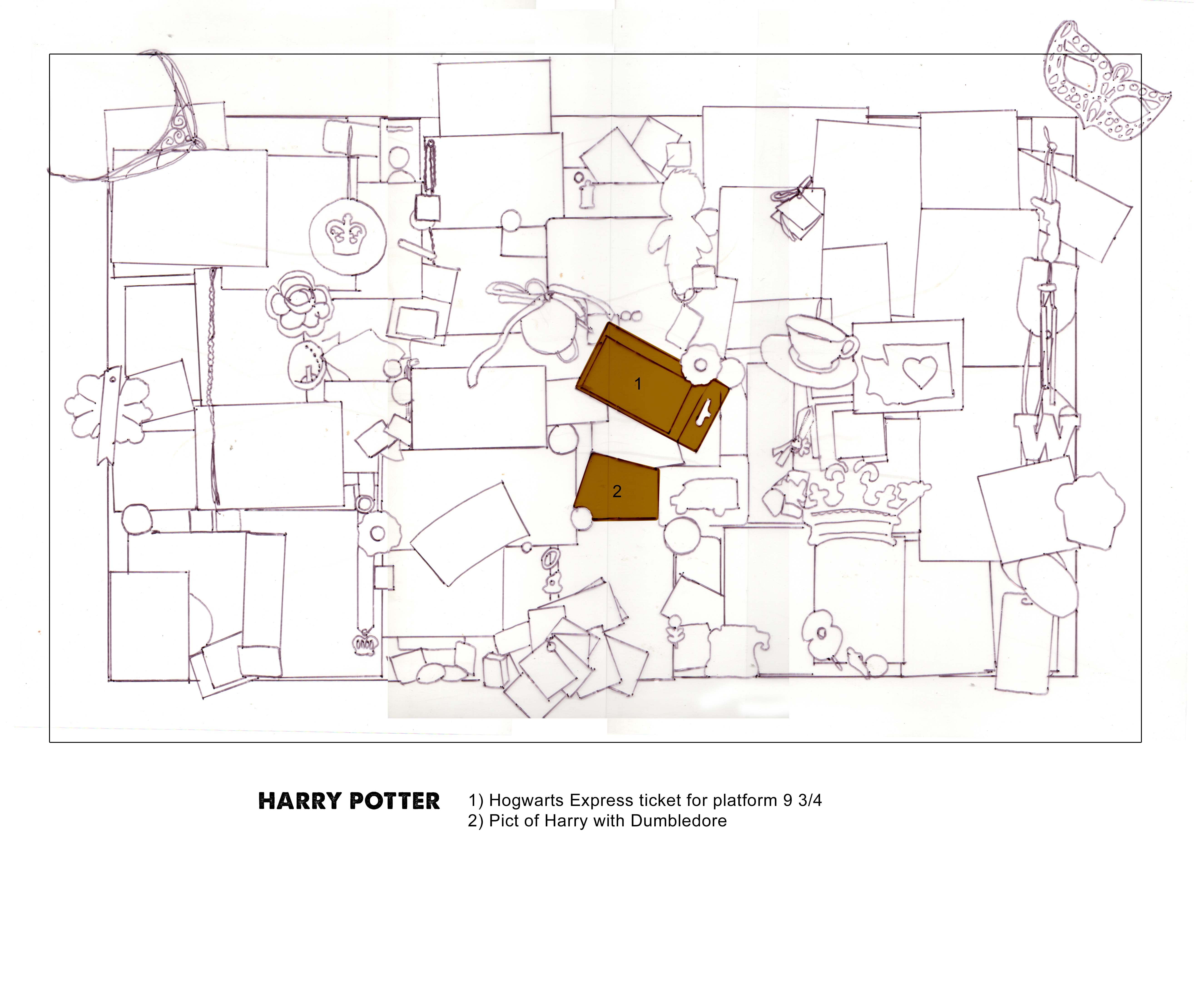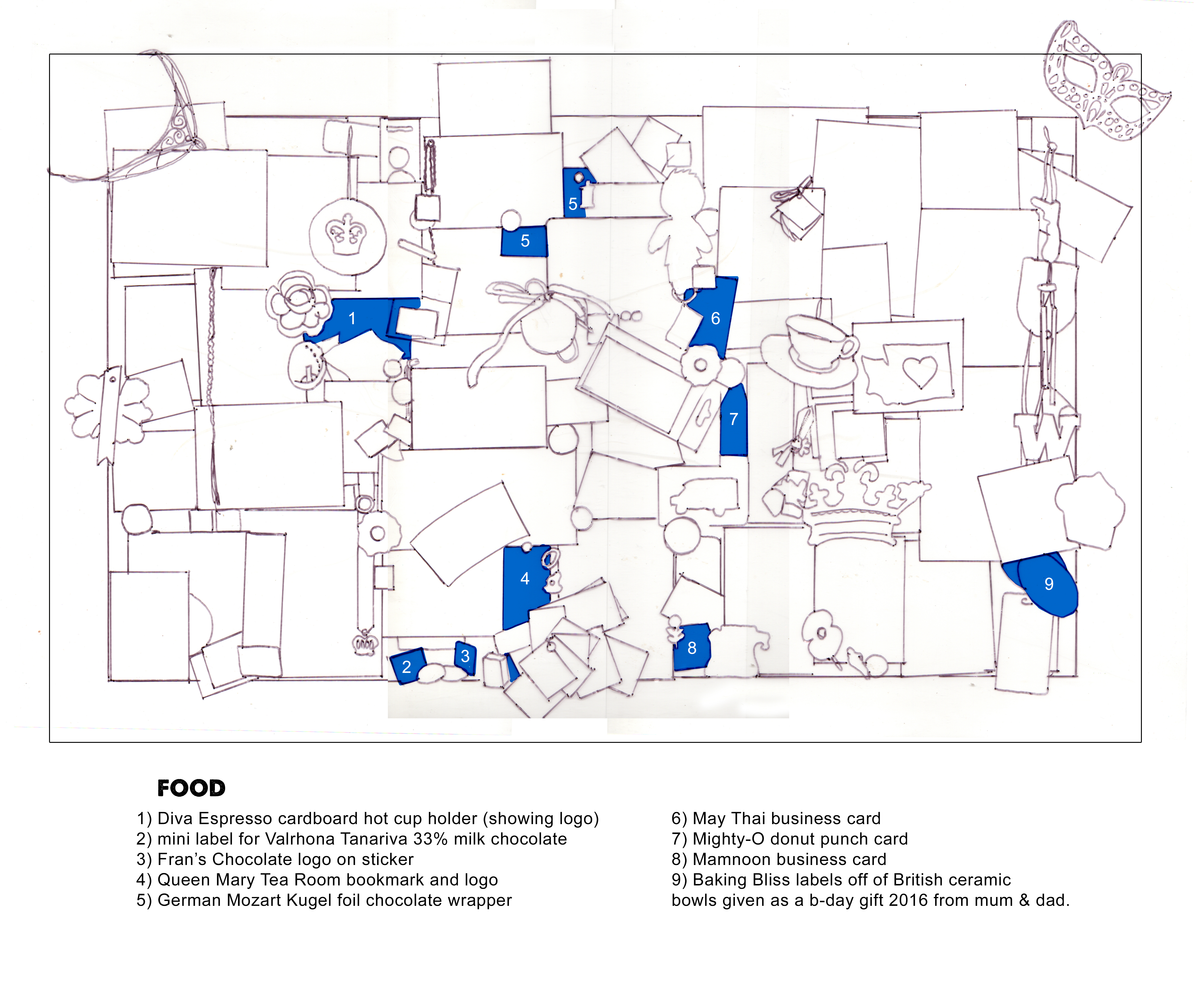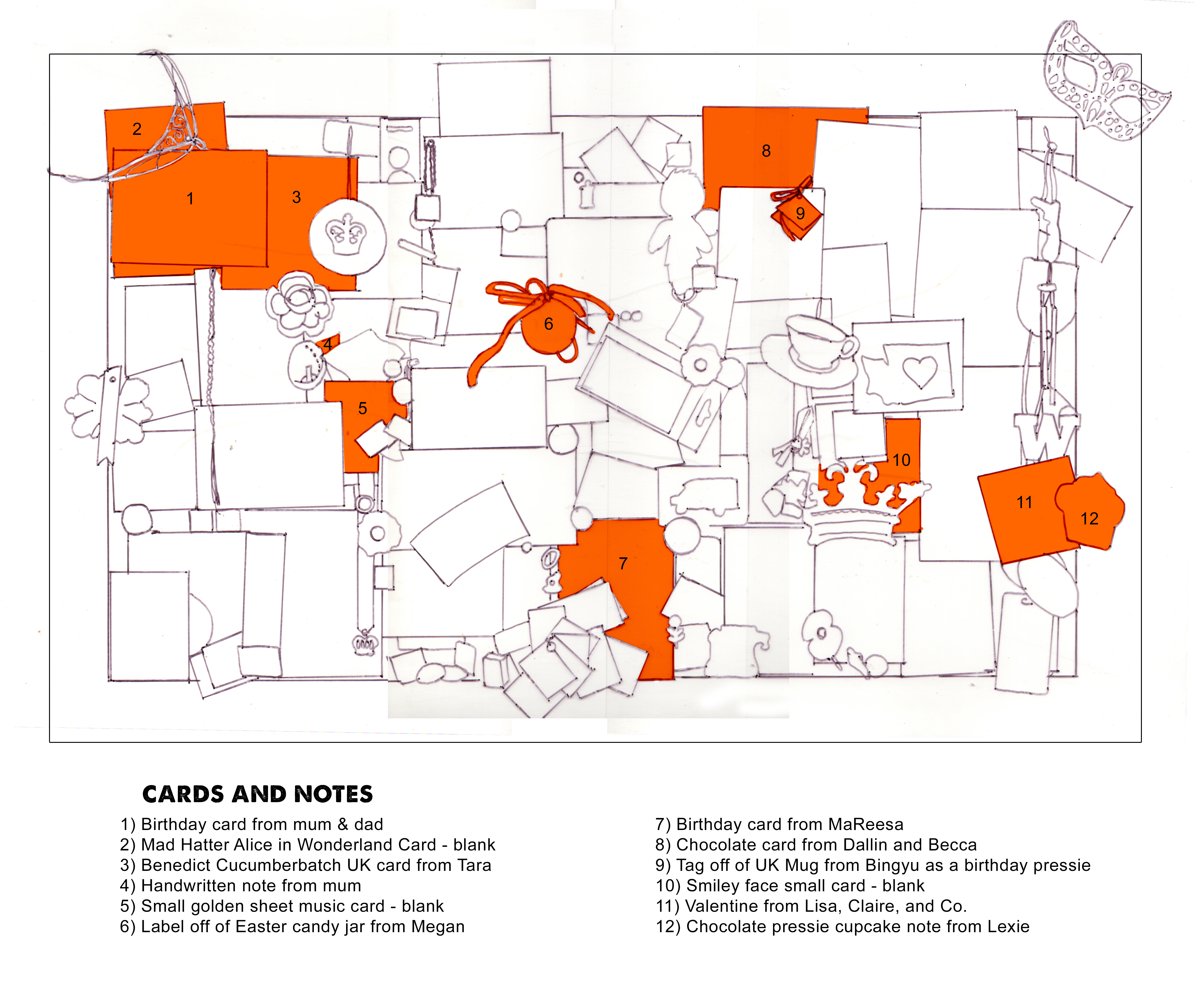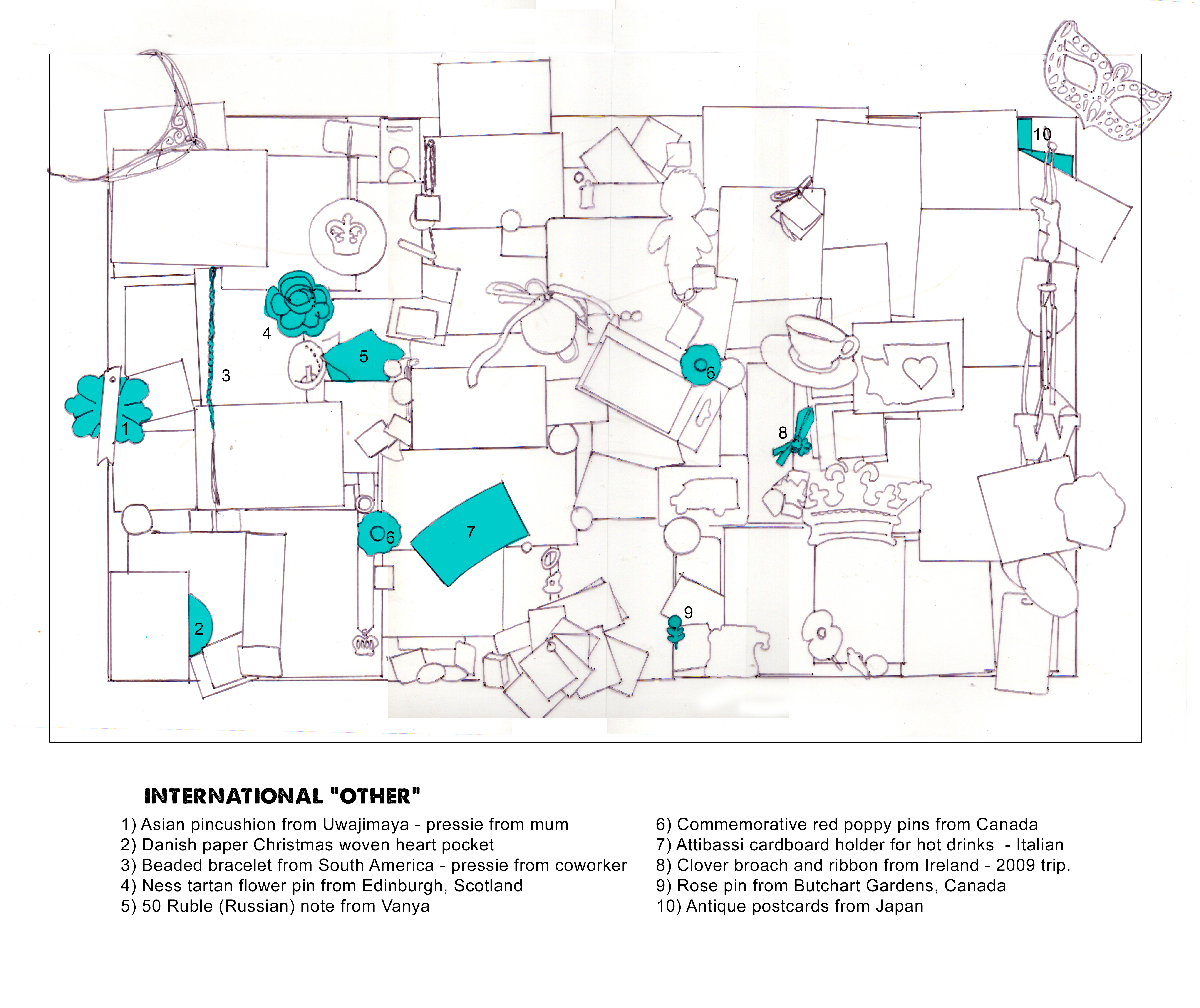 I had let my board grow for 2 years before this project. In a 2017 graphic design study / analytic effort, I mapped out my bulletin board according to category or theme. This exercise was an interesting way to see what such collected items said about me. The categories ended up being: Art, Cards & Notes, Church, Doctor Who, England, Food, Harry Potter, Hobbit/LotR, International “Other,” New Zealand, Seattle, Tickets, and Misc. Click to view details.