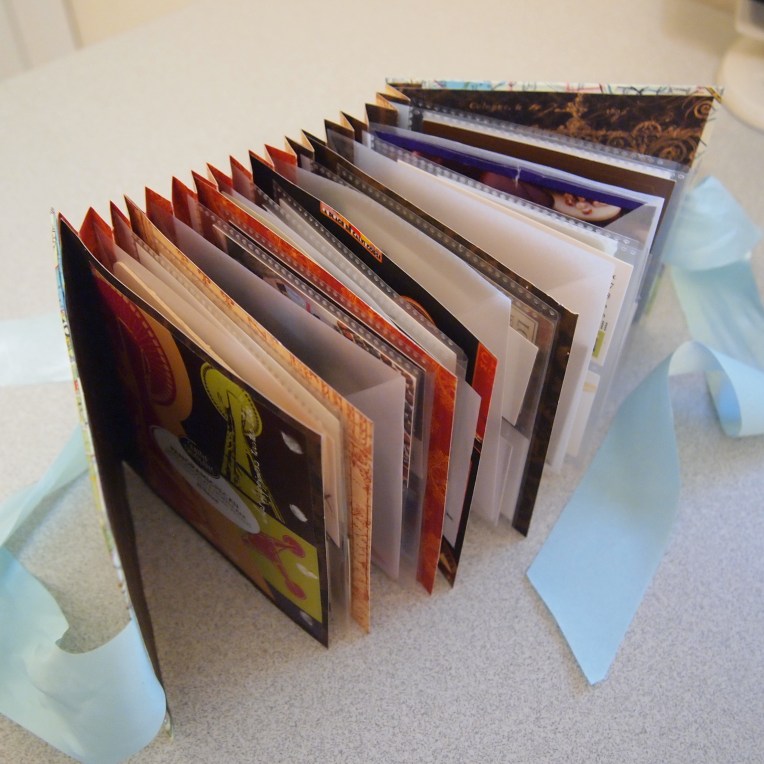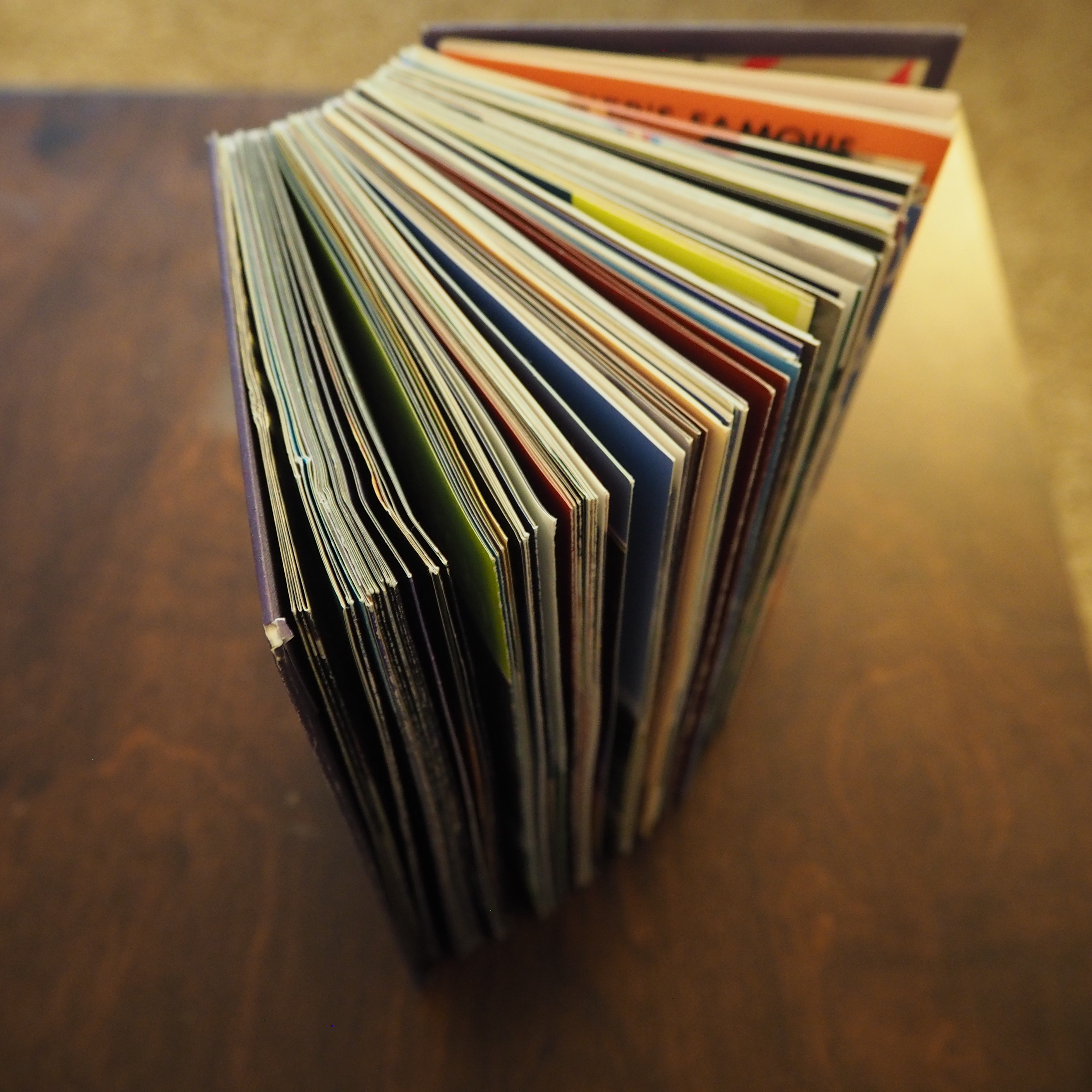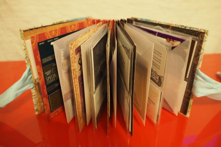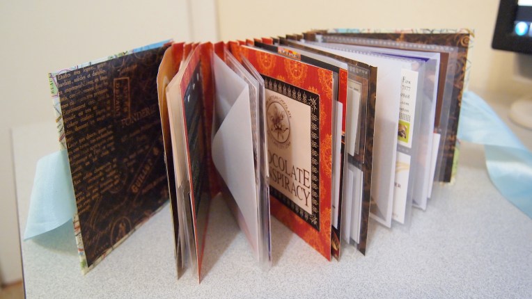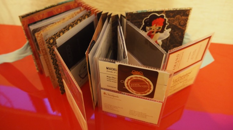 This is my CHOCOLATE BOOK – it contains business cards, stickers, cards, guides, and promo materials for a whole variety of chocolate makers. All of these materials were gained through multiple trips to the annual Northwest Chocolate Festival in Seattle, WA.