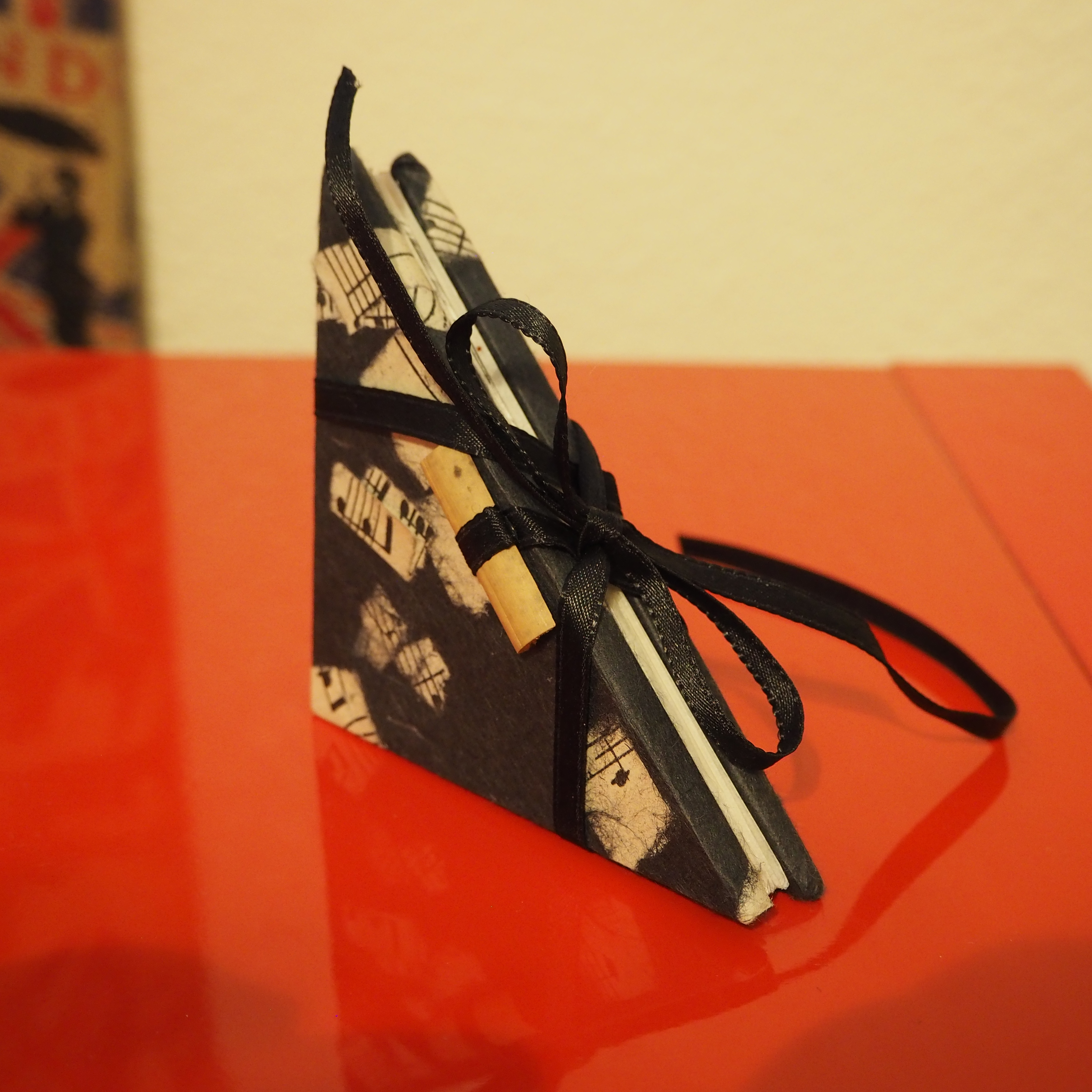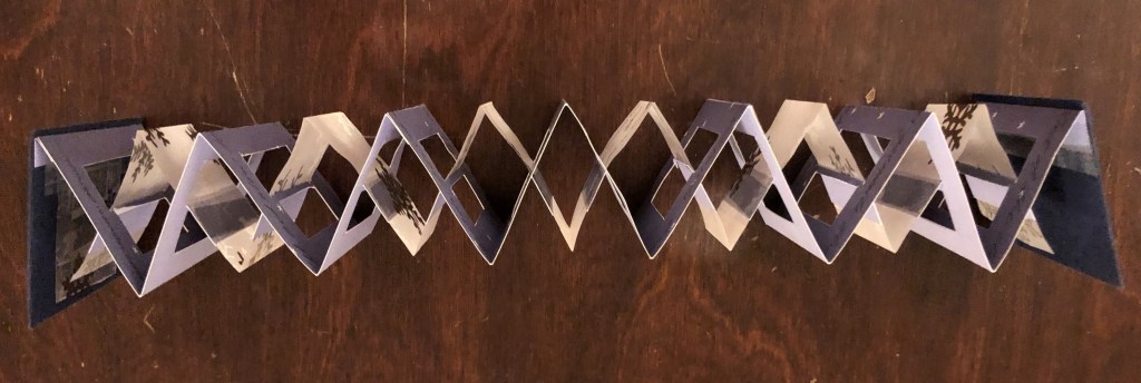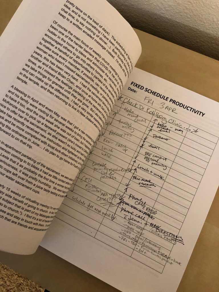 JUN 2020 – This small handmade book has a Japanese stab binding with waxed linen thread. It is made up of 40 pages – one for each day that clinic was closed to patients but we were required to be present in clinic. One side has a “planned” vs “what actually happened” sheet by the half hour, and the other has a printed version of, “my COVID story for posterity.”