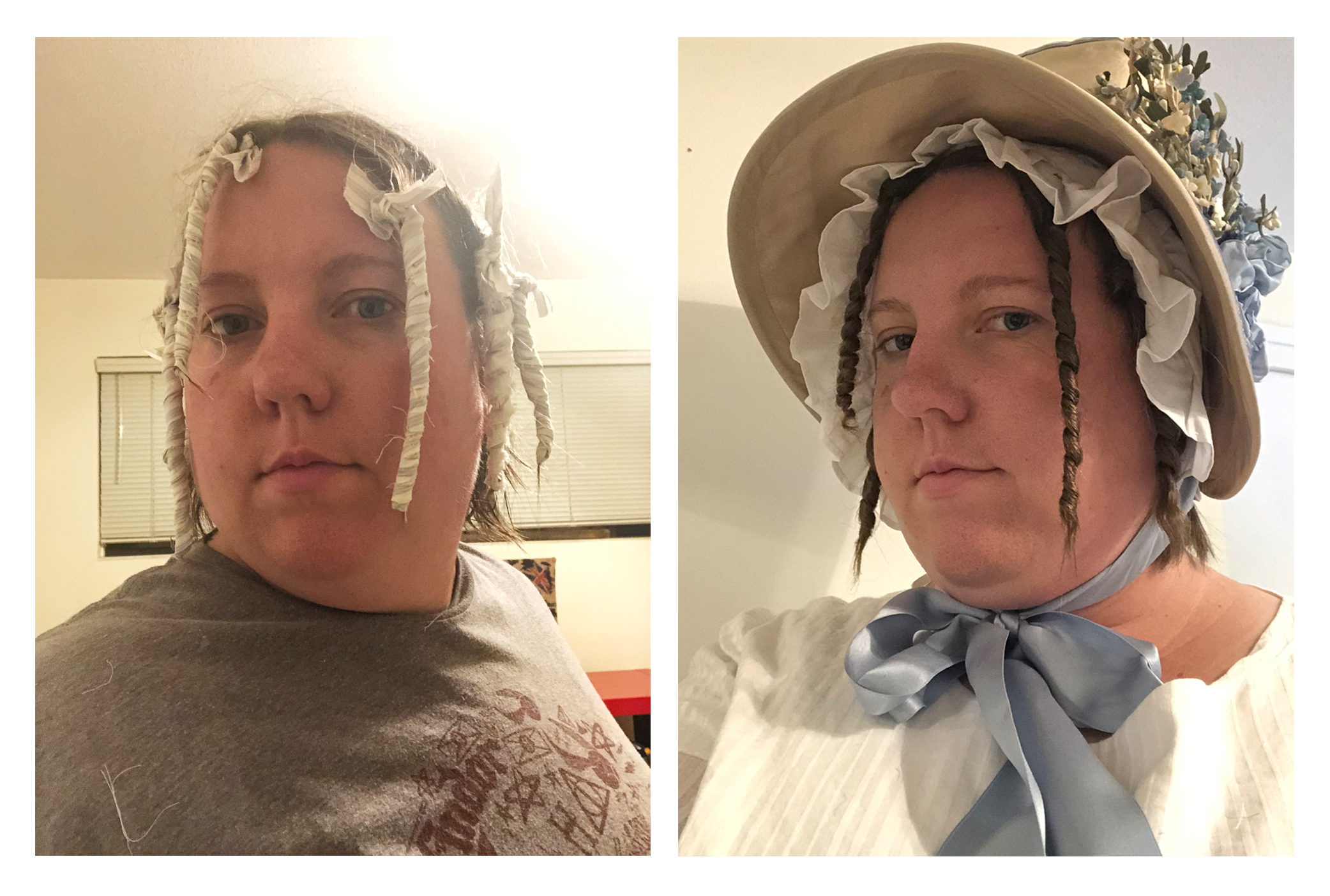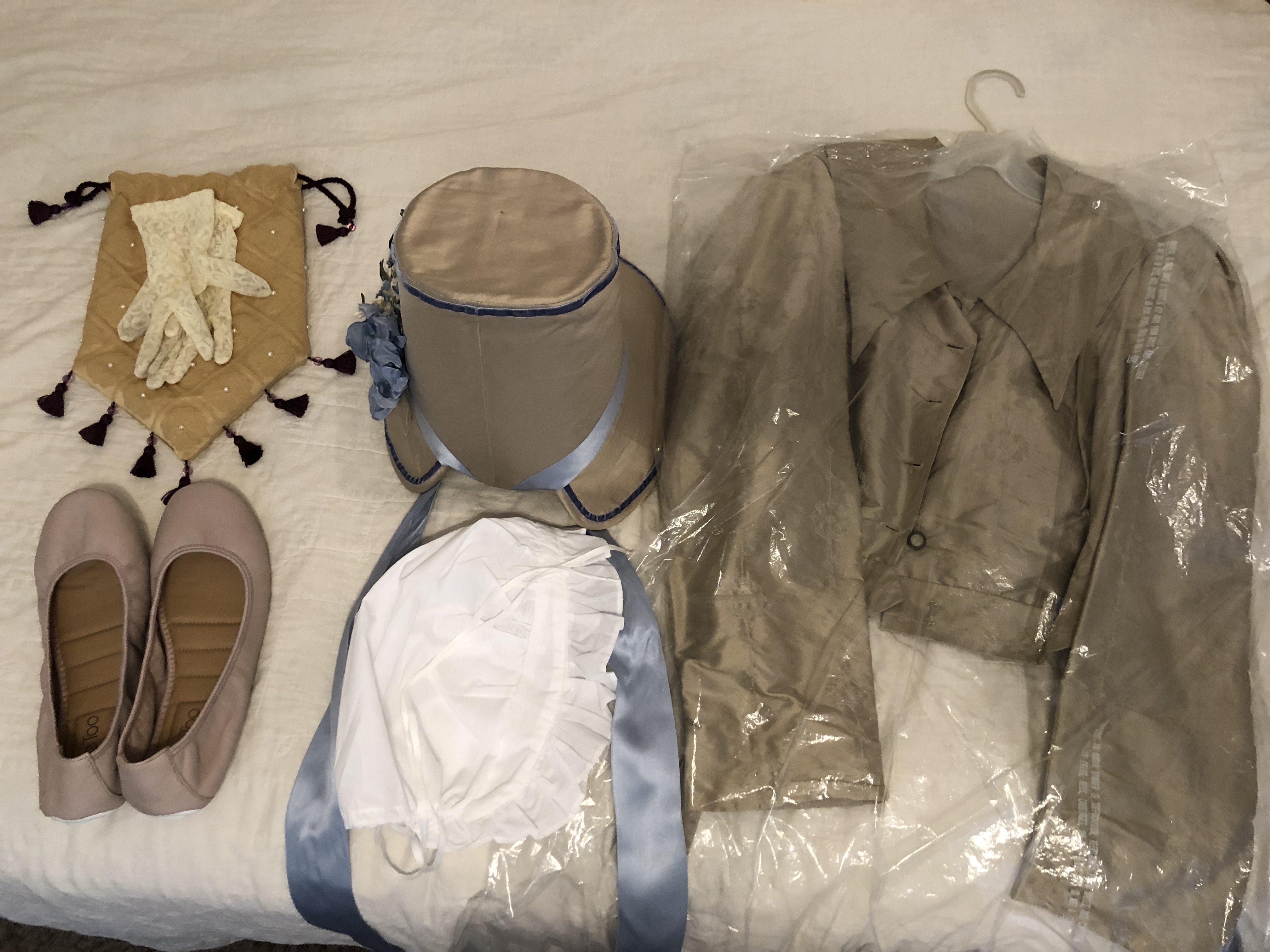My hat and jacket were made by Regency seamstress and WRS member Ruth Haring (in the light blue outfit wearing glasses). My reticule (purse) and white dress were graciously sewn by my mother: Christine A. Quinn. She sews historic doll clothes for sale on etsy. My shoes are from the company Me Too and highly recommended for comfortable flats. My white under-bonnet is from the etsy store Bonnet and Dresses. My hair was done in rag curles based off of this tutorial (you roll your hair when wet and sleep on it overnight).