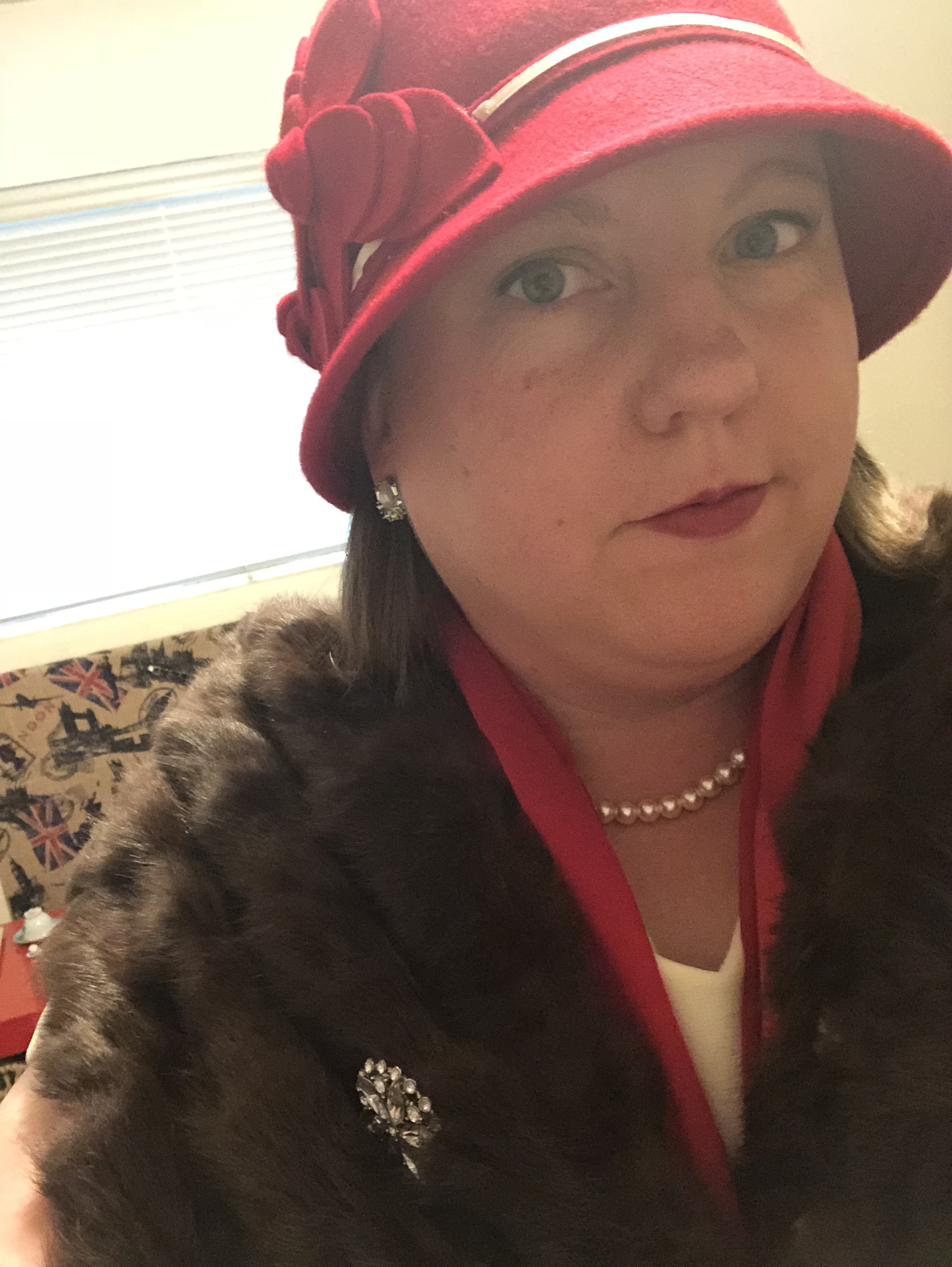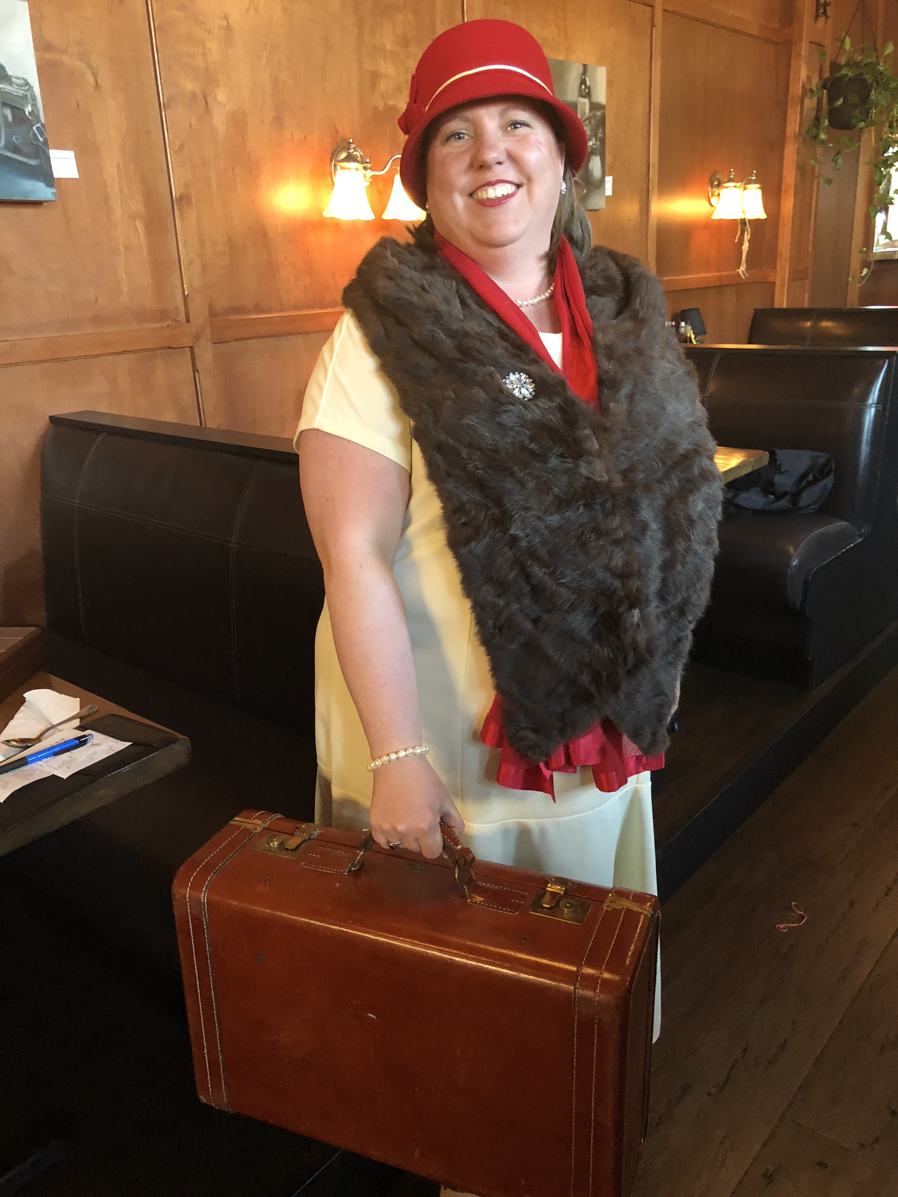 Costume wise, I’m wearing an antique fur from New Zealand. The red scarf is Calvin Klein, the cloche hat is Nine West, and my shoes are a thrifted pair of Naturalizer heels (comfort in costuming!). My suitcase and purse are also antiques. The dress is handmade.