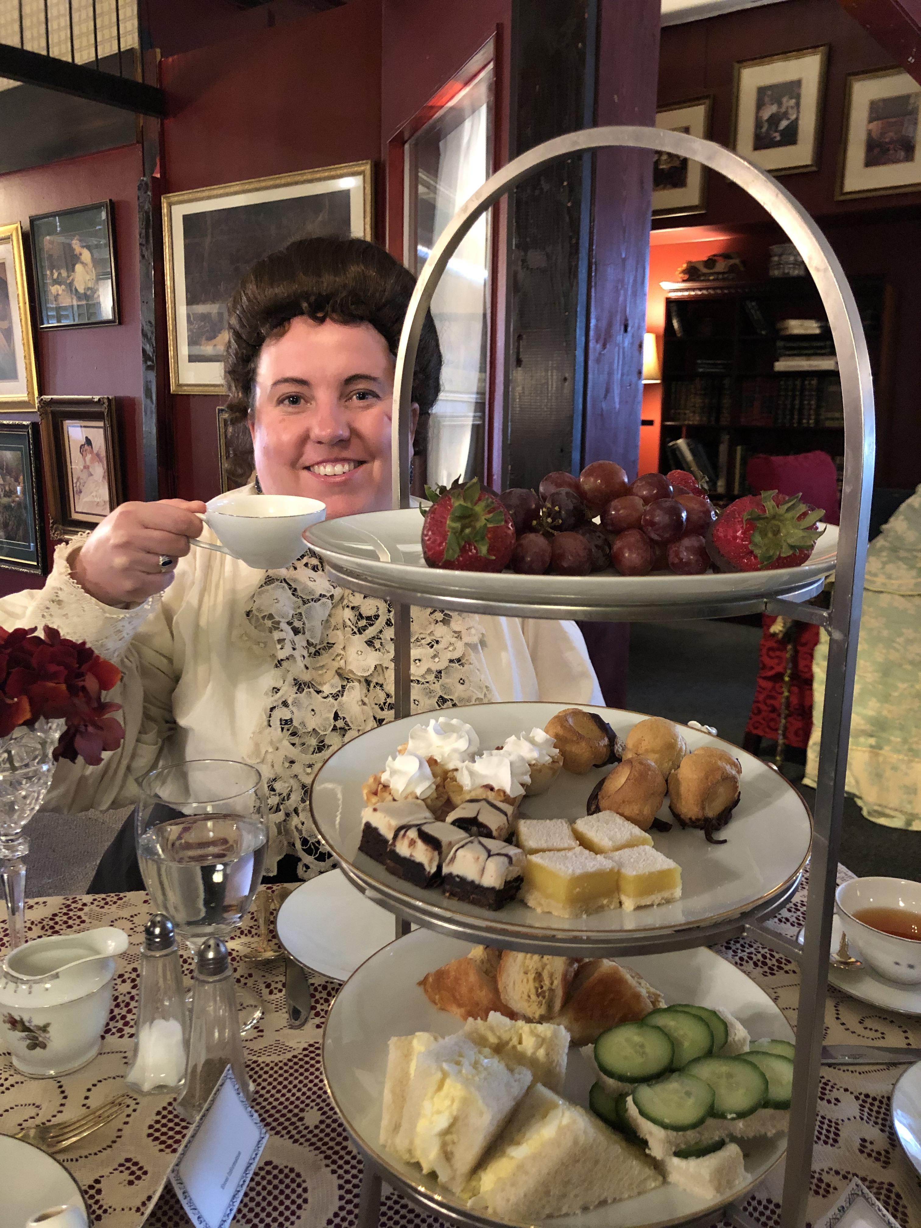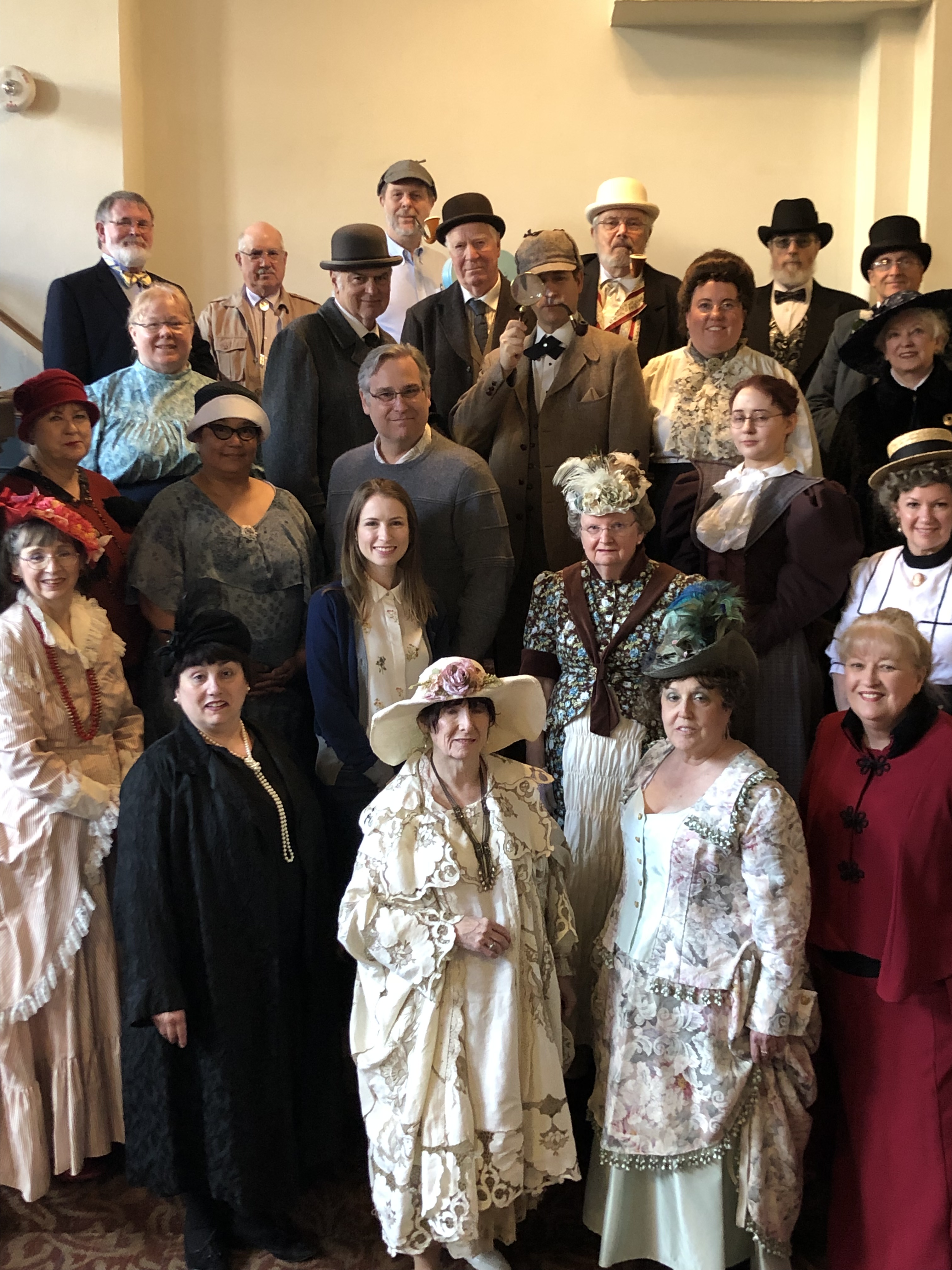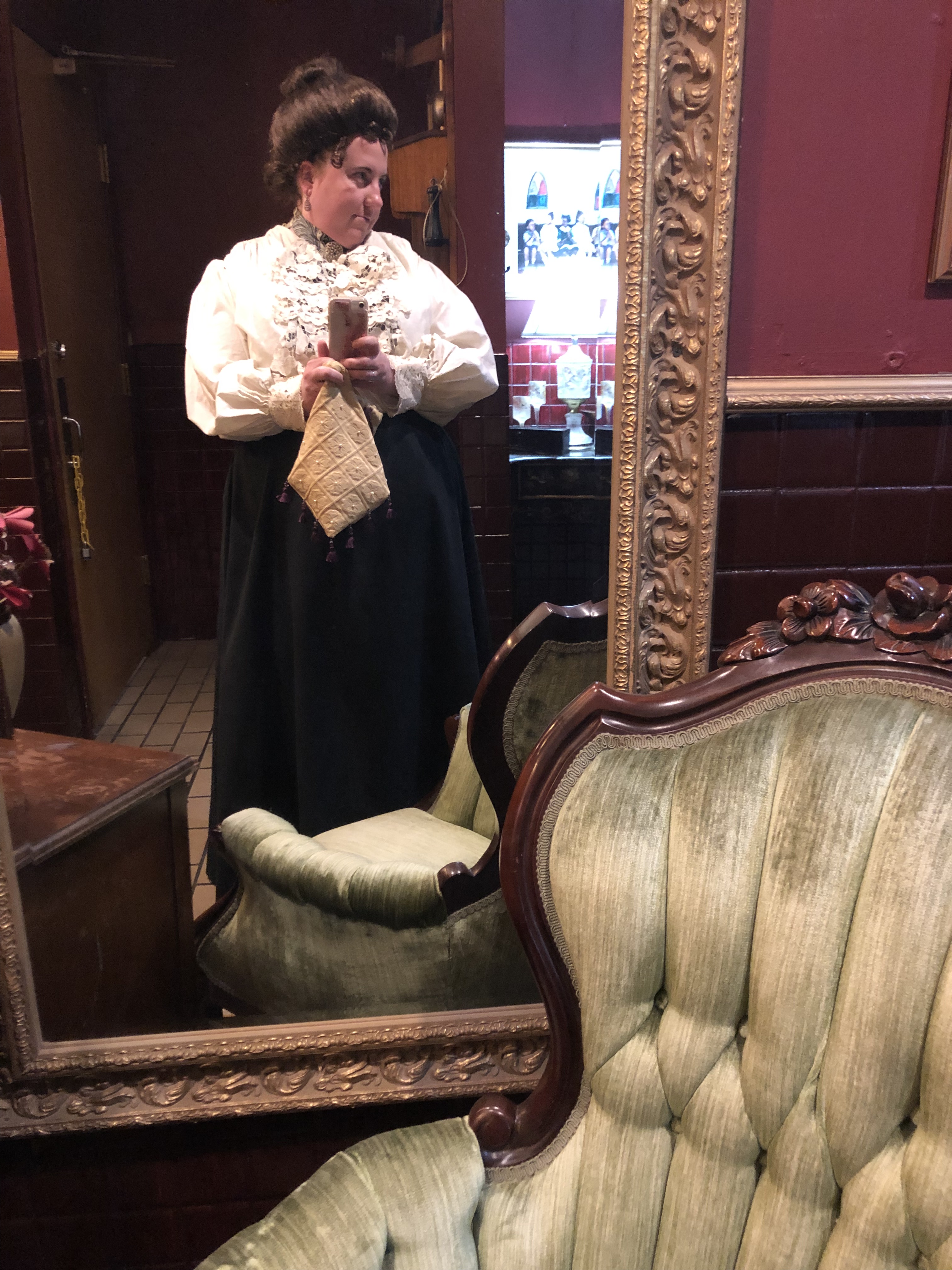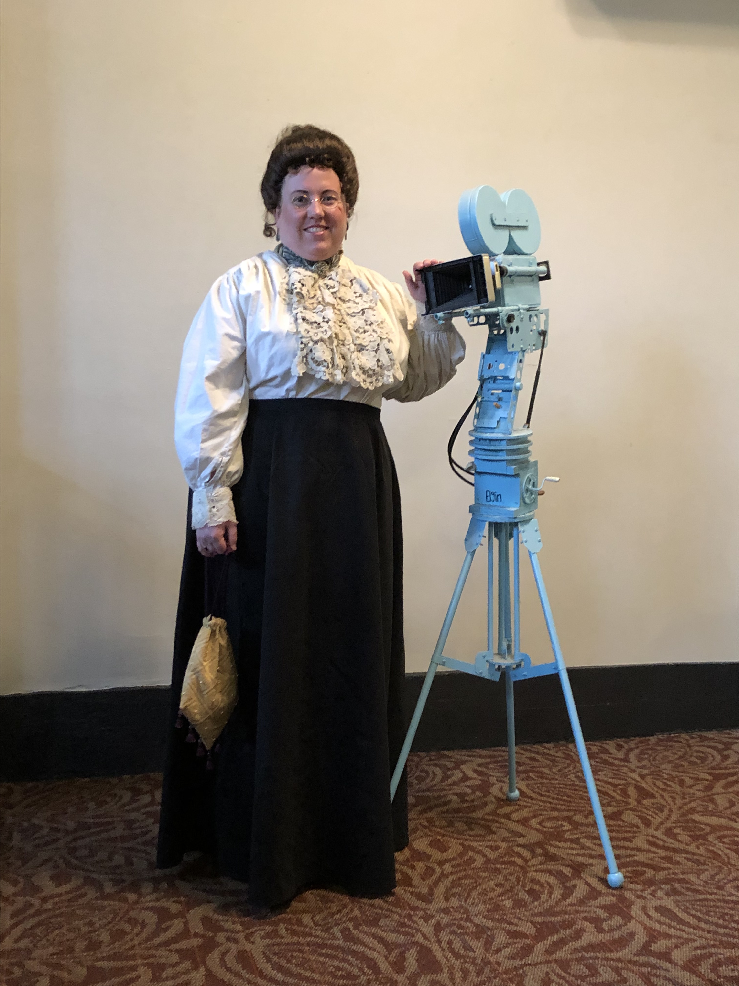 Costume wise, this was a new look for me – Edwardian. This also marked getting back into the wig game. I am wearing the McKenna Wig and Edwardian walking skirt from Historical Emporium. The glasses are antique and are a nod to the short story: Sherlock Holmes and the Adventure of the Golden Pince-Nez.