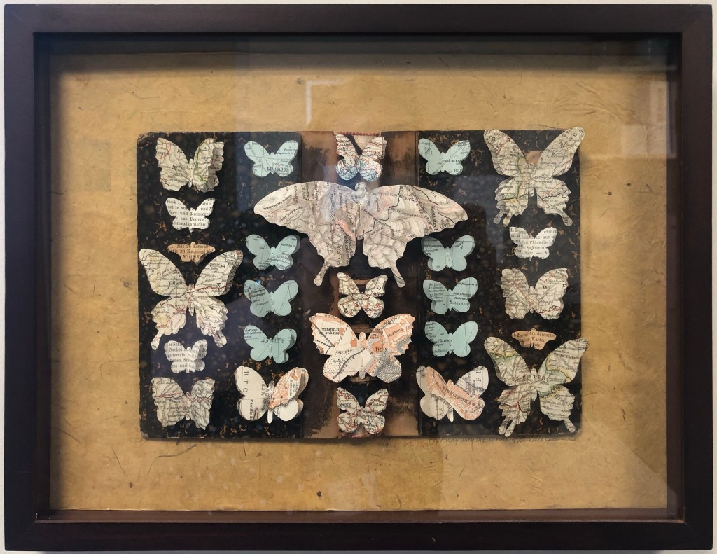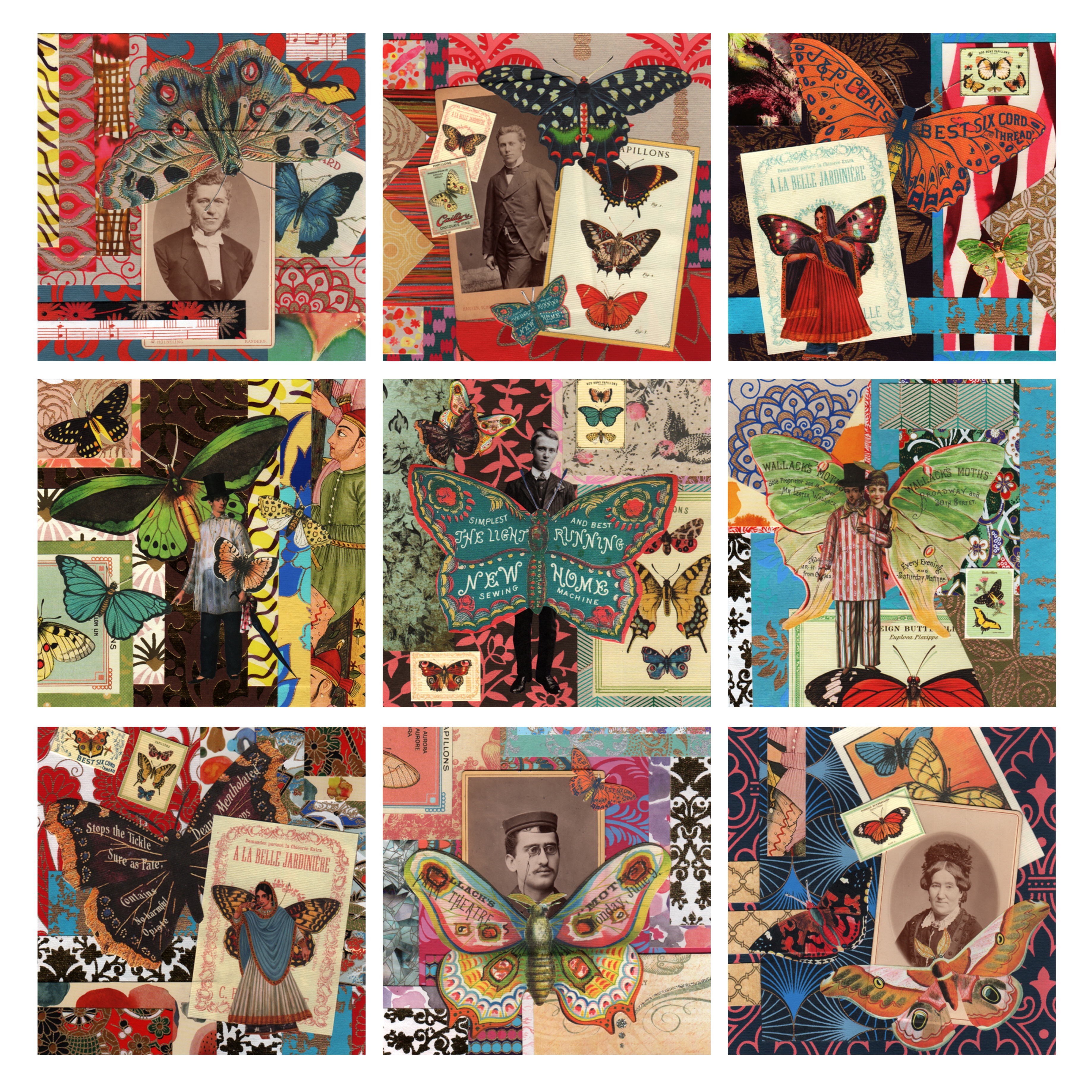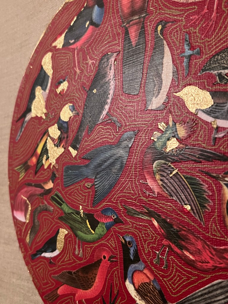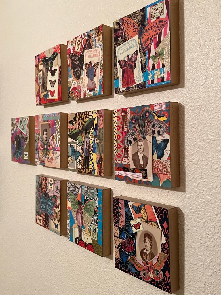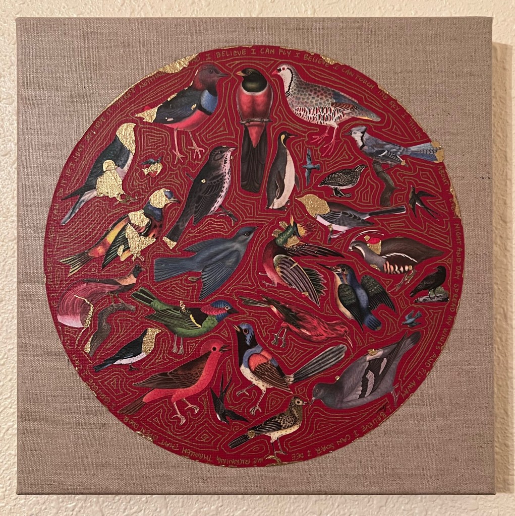 I Believe I Can Fly series – 6 x 6” paper collage on wood.Early Pieces, 17 x 11” (13 x 19 framed), SEP 2003, Paper collage.Six Impossible Things Before Breakfast: A, B, C, D. 10 x 8 x 2”. Mixed media on wood. March 2022.Fly Away With Me, 14 x 11” framed, March 2014, paper in shadow box.Come Fly with Me II (2015), Come Fly With Me III (2022), Fly Away With Me IV (2022), Fly Away With Me II (2022) – 14 x 11” framed, paper in shadow box.Come Fly With Me III, 14 x 11”, May 2022, Paper in shadow box.Bird Kintsugi, 12 x 12”, JUN 2022, Paper and gold ink on linen canvas.