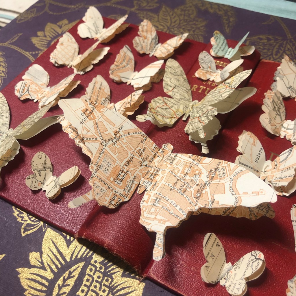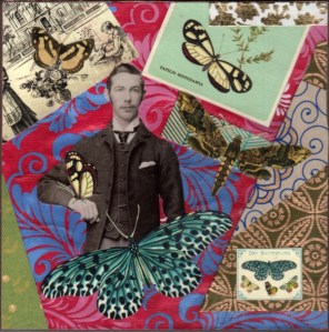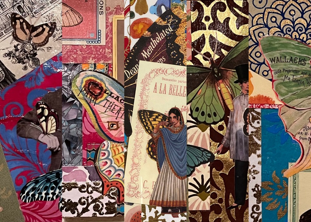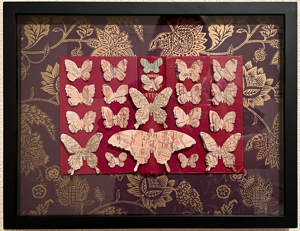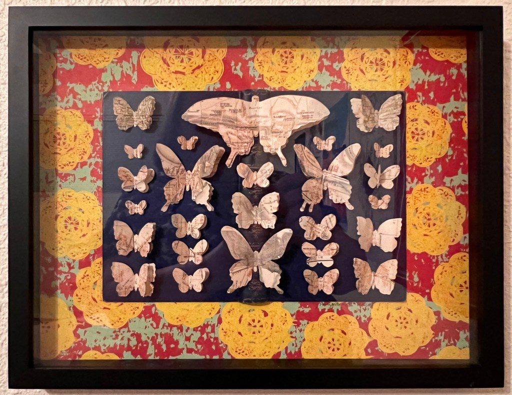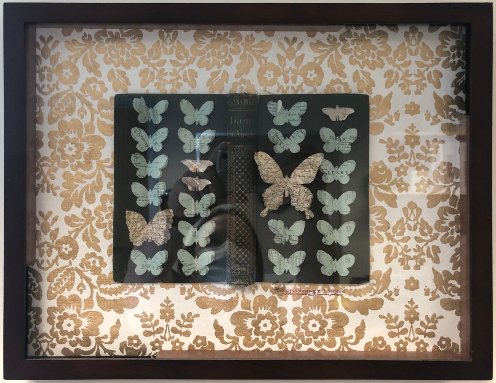 I Believe I Can Fly series – 6 x 6” paper collage on wood.Early Pieces, 17 x 11” (13 x 19 framed), SEP 2003, Paper collage.Six Impossible Things Before Breakfast: A, B, C, D. 10 x 8 x 2”. Mixed media on wood. March 2022.Fly Away With Me, 14 x 11” framed, March 2014, paper in shadow box.Come Fly with Me II (2015), Come Fly With Me III (2022), Fly Away With Me IV (2022), Fly Away With Me II (2022) – 14 x 11” framed, paper in shadow box.Come Fly With Me III, 14 x 11”, May 2022, Paper in shadow box.Bird Kintsugi, 12 x 12”, JUN 2022, Paper and gold ink on linen canvas.