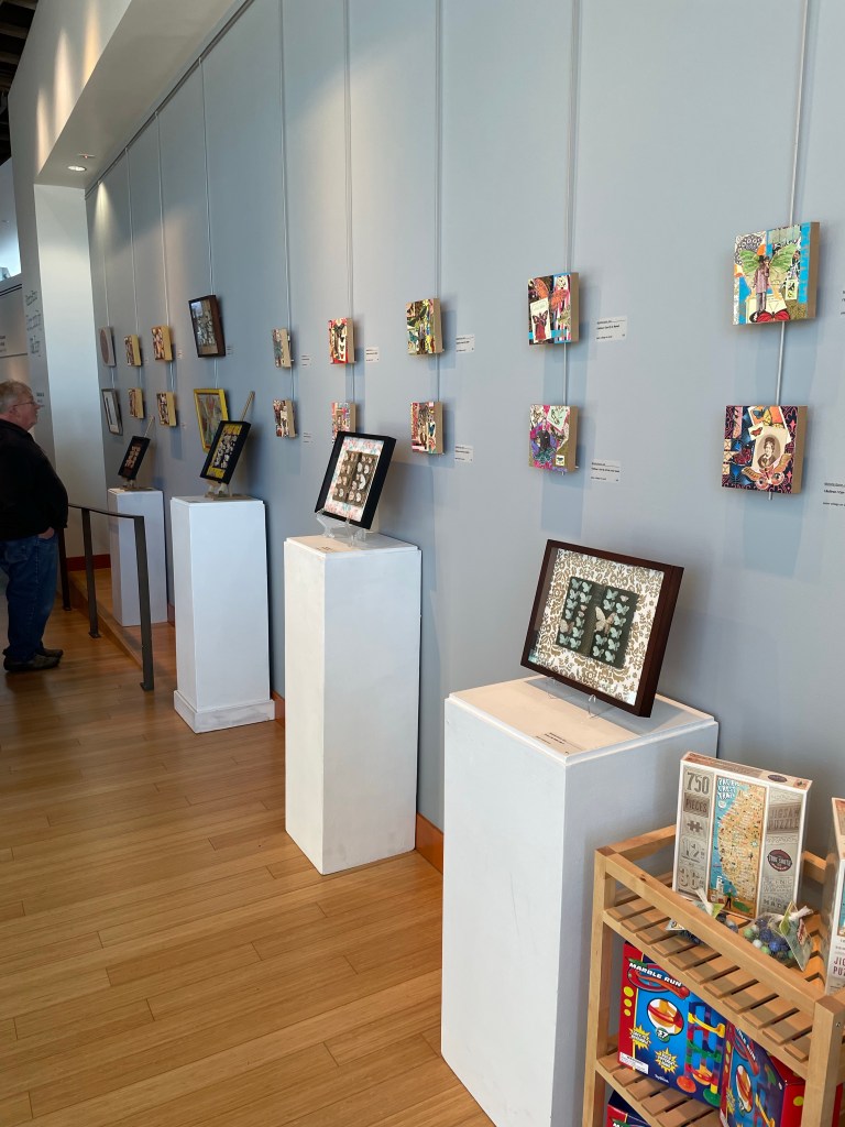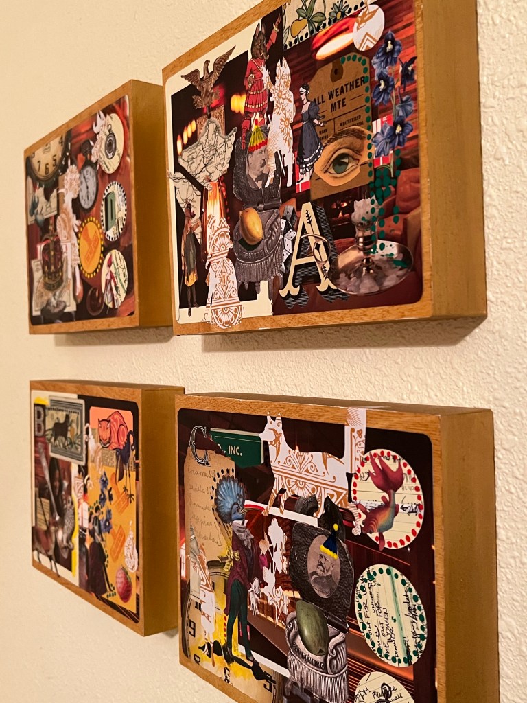 Travel Chaos, 12 x 9” (17 x 14” framed), AUG 2015, Collage/ mixed media.Six Impossible Things Before Breakfast: A, B, C, D. 10 x 8 x 2”. Mixed media on wood. March 2022.NOV-DEC 2022 – Angela Q Hunt and Michelle Quinn, Moses Lake Museum and Art Gallery, “I Believe I Can Fly,” art show.