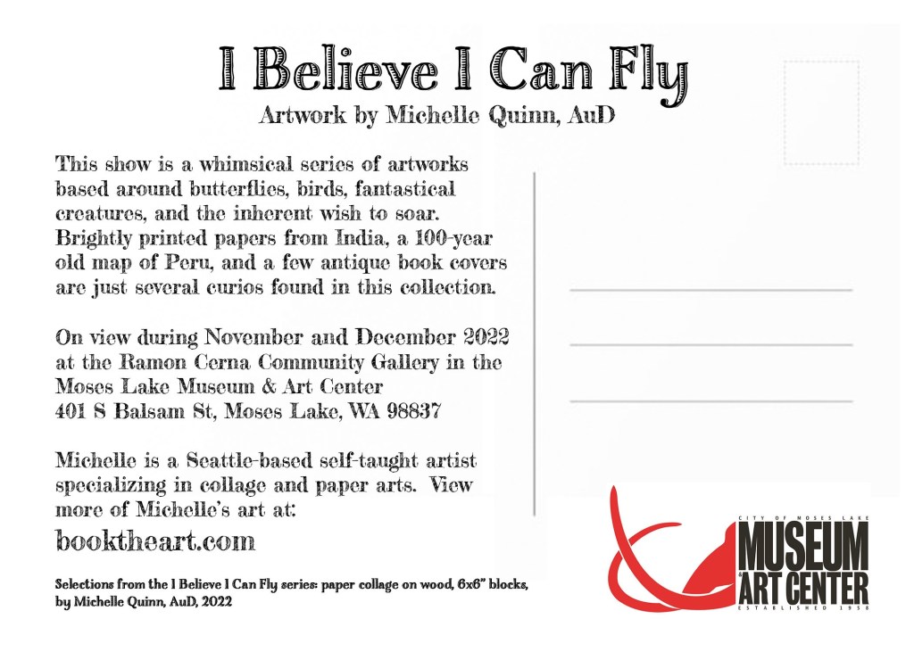 The I Believe I Can Fly art show contains art made mostly in 2022 and is for viewing at the Ramon Cerna Community Gallery in the Moses Lake Museum & Art Center during November and December 2022. Most pieces are for sale. This show was by invitation from my sister and fellow artist: Angela Hunt.