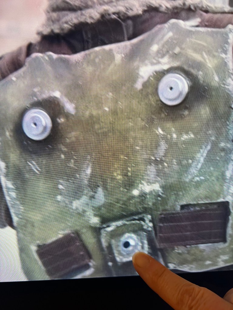 The flank vest is brown duck cloth with straps to hold on the back plate and decorative top stitching. It has black cording around the neck and arms. Closure is velcro along one under-arm seam.