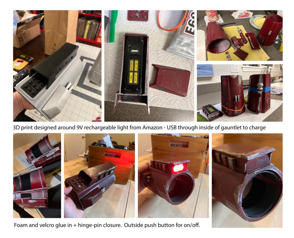 Right Gauntlet – 3D printed clam shell design with hinge pin, custom design, constrains an Energizer flashlight with a red filter and on/off button. Rechargeable battery.