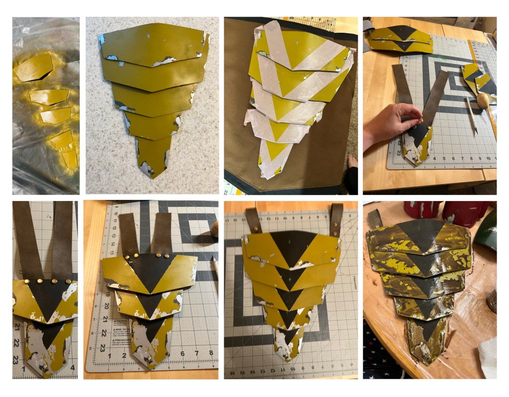 Below are several photo montages showing some of my armor build. The shoulders, gauntlets, and hand plates are all 3D printed, otherwise the plates are made with 3mm plastic sintra – a material that can be moulded with heat.