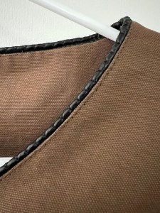 Vest – flank vest is also custom designed and sewn out of brown duck cloth with decorative black edging, and stitching using orange denim thread. Velcro and snaps hold armor plates in place