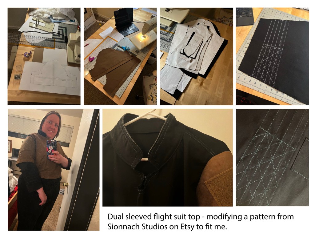 Below is a montage regarding my flight suit top – I made a mock-up in muslin before cutting out the actual piece. The black fabric is cotton and the brown fabric is heavier duck cloth. My flank vest is made out of the brown duck cloth. The two-toned sleeve design is inspired by the costumes in The Mandalorian.