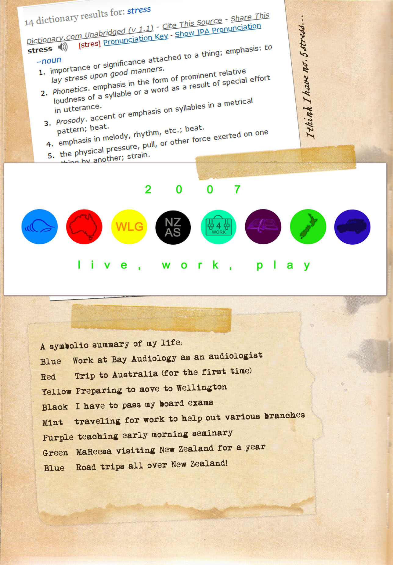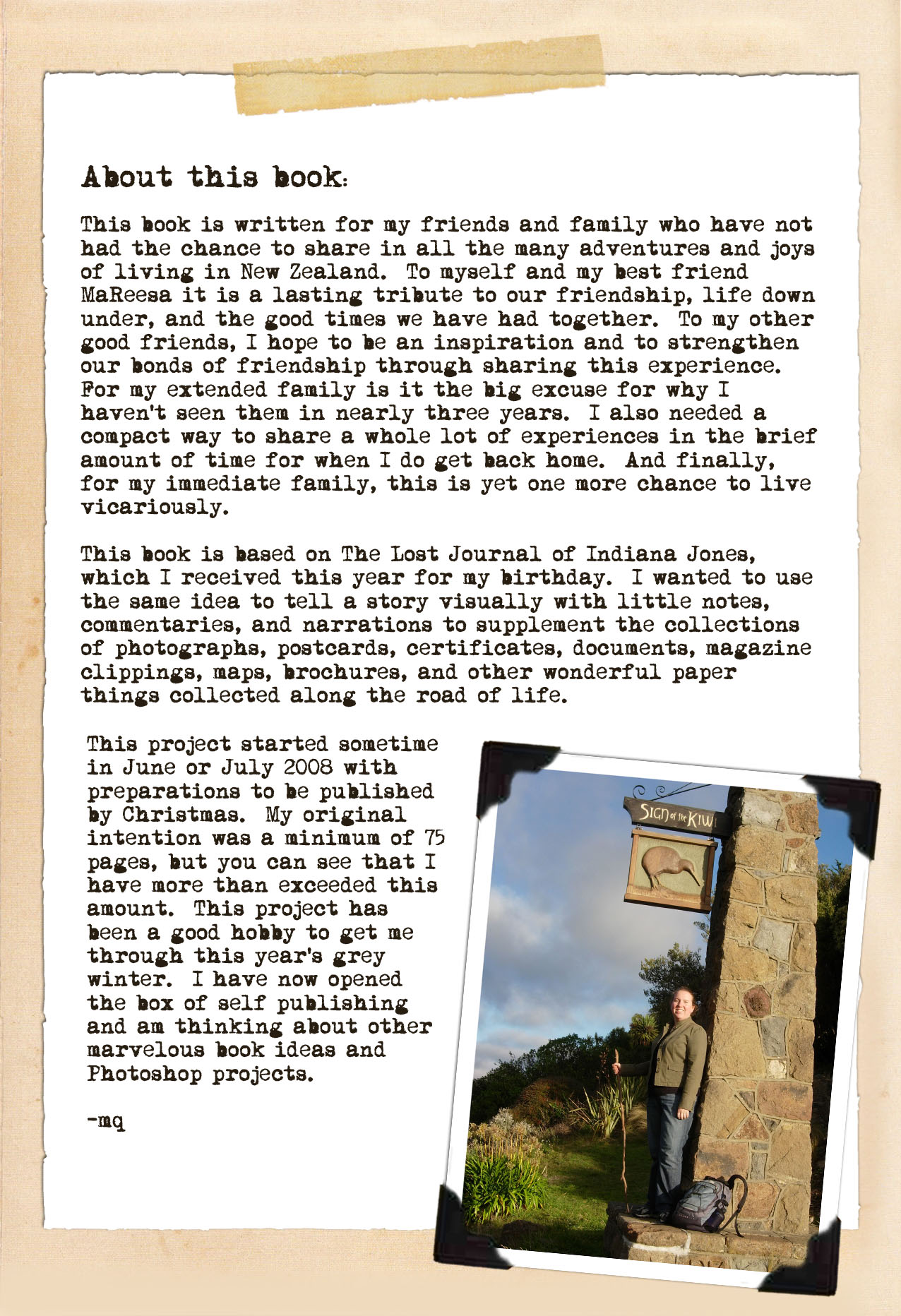 The book was designed to document my first few years living and working in New Zealand, so I could share what I had been up to with family, and extended family. I had a planned multi-week trip back to the states in early 2009, and brought these books in tow to pass around and share.