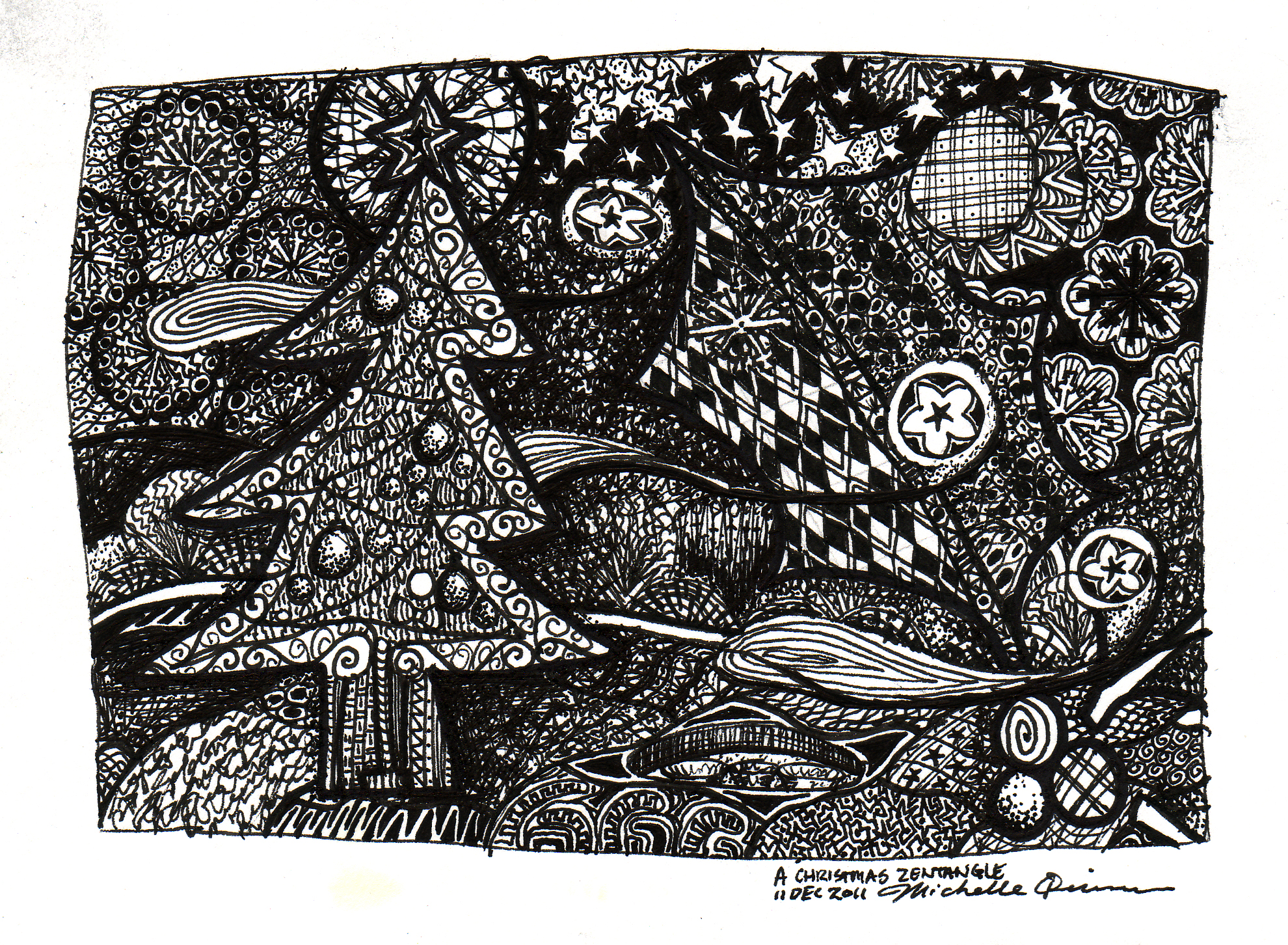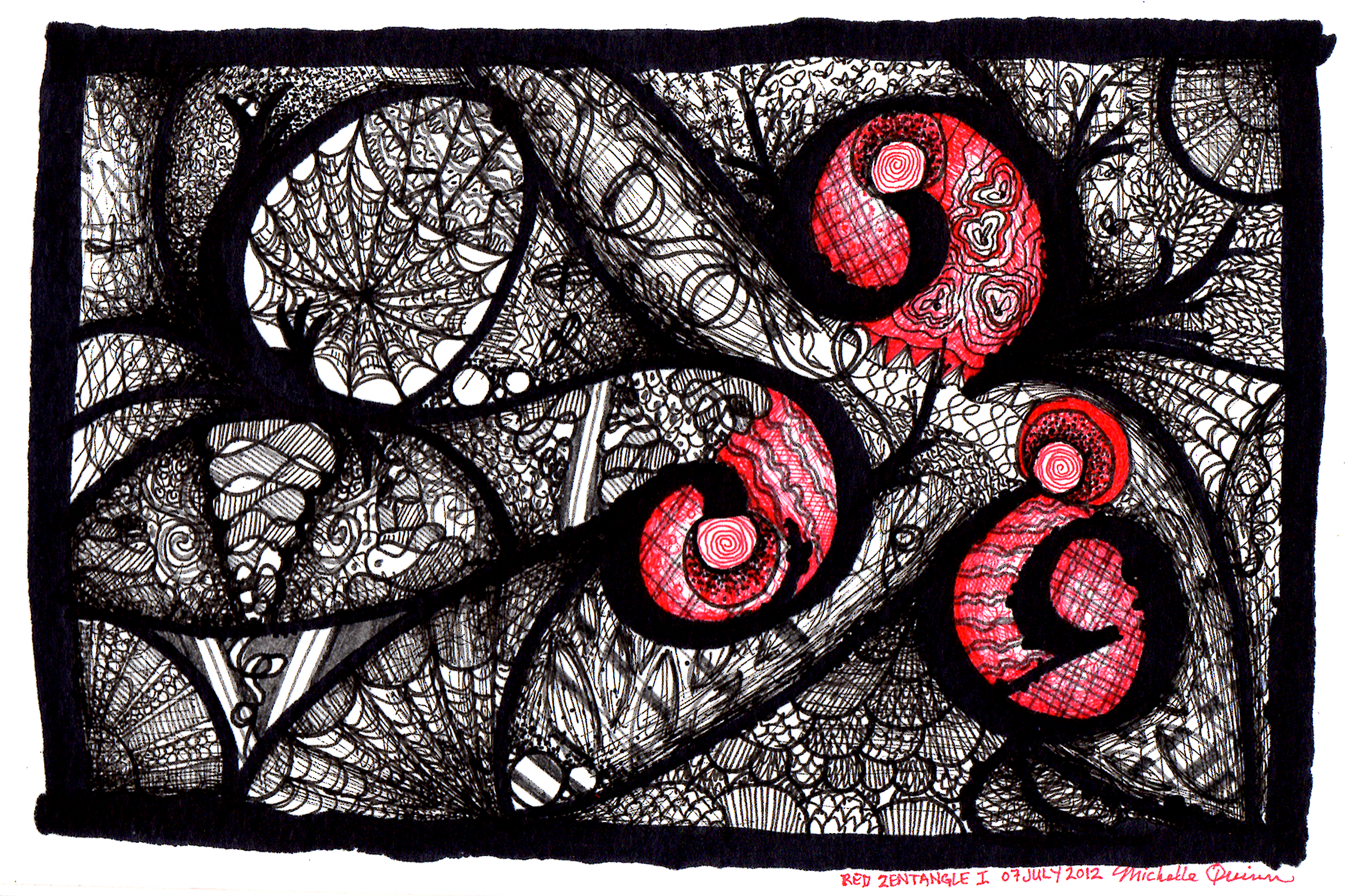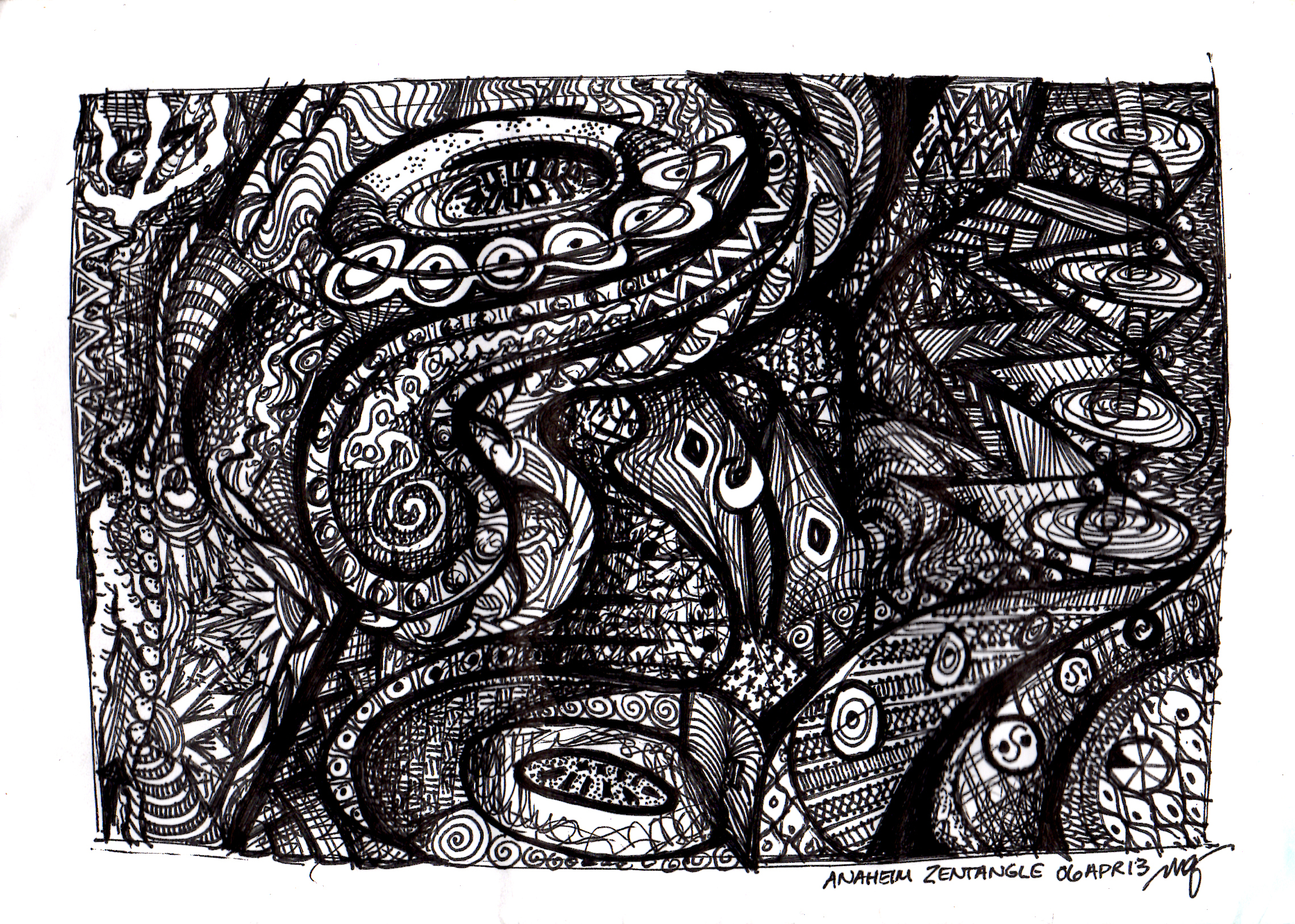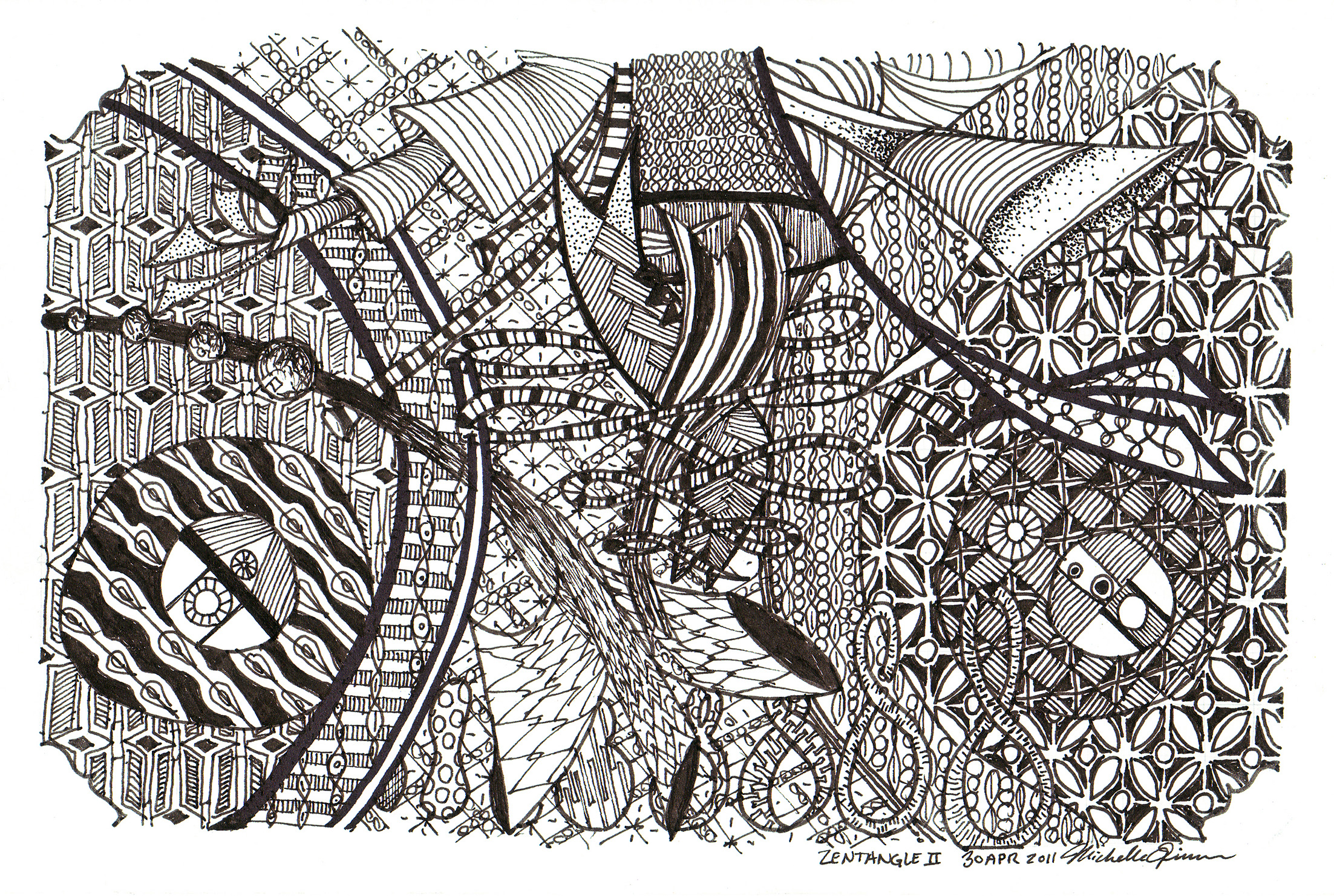 Zentangle is an abstract art form based on drawing larger shapes, and then filling them in with smaller repetitive patterns. It’s usually black and white with ink as the medium. It is designed to be a relaxation and focus exercise, but I just call it doodling.